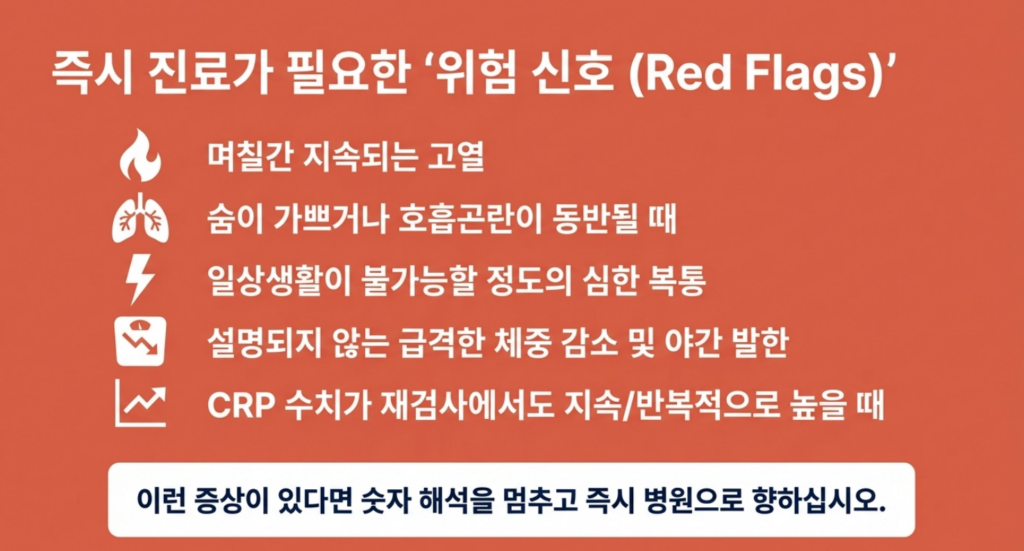 결국 핵심은 이겁니다. “CRP가 높다 = 무조건 응급”은 아닙니다. 하지만 “CRP 상승과 함께 위험 신호가 나타난다면” 그때는 지체 없이 병원으로 향하는 진료의 기준이 되어야 합니다.