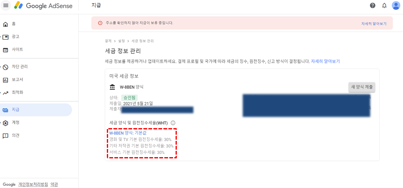 이렇게 구글 애드센스 미국 세금 정보를 제출해 봤습니다. 이제 10일밖에 남지 않았습니다. 작성하여 제출하면 미국 내 발생된 수익의 30%만 공제되는 것이고, 제출하지 않는다면 한국에서 발생하는 수익까지 포함한 전체 수익의 24%를 가져간다고 합니다. 10분이면 작성하고 제출까지 가능하니 꼭 따라 하셔서 불이익 없으셨으면 좋겠습니다.