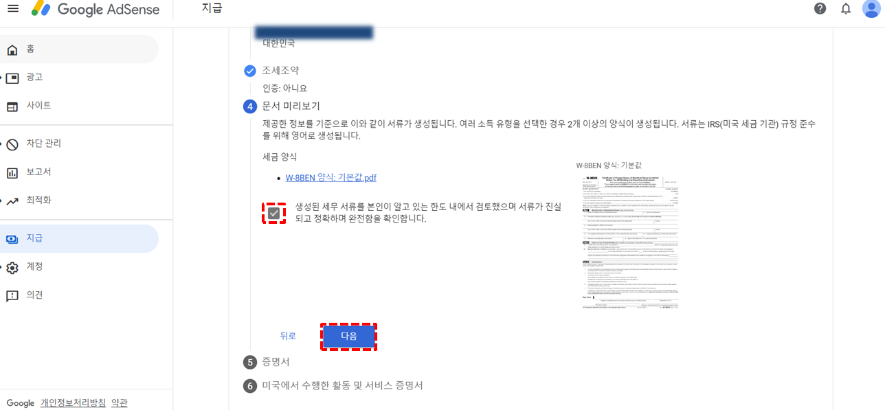 마지막 단계입니다. 애드센스 보고서를 보시면 아시겠지만 우리나라뿐 아니라 미국에서도 아주 조금이지만 광고를 클릭한 내역이 있을 것입니다. 따라서 미국 내에서 활동했다는 질문에는 "예"를 선택하고 아래는 애드센스에서 이전에 대금을 지급받았으면 아래 항목을 저처럼 아직 지급을 받지 못한 분들이라면 "대금을 지급받은 적이 없는 기존 세금 정보 제공"을 클릭하고 제출을 누르면 됩니다.