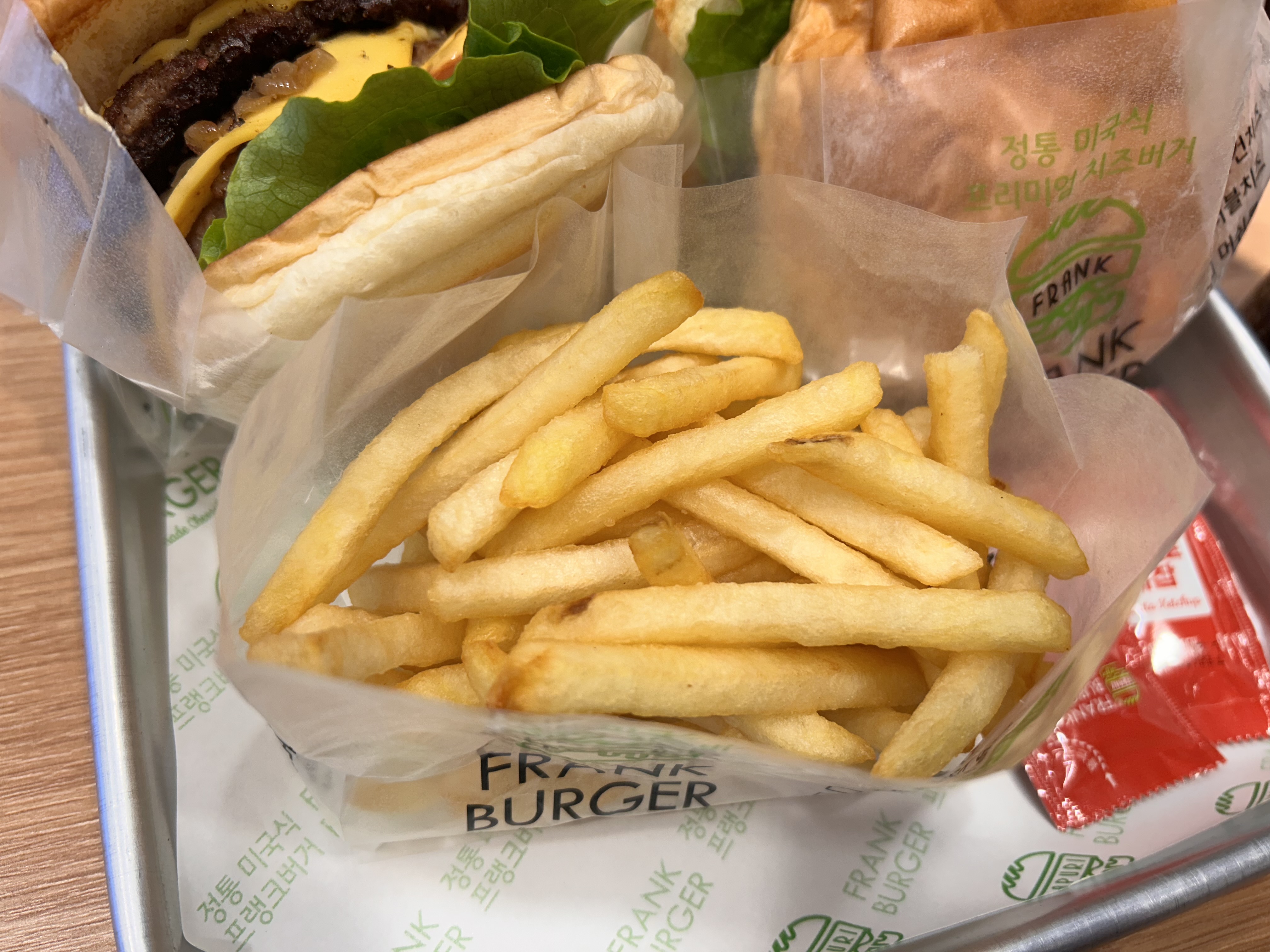 처음에 나오자마자는 햄버거가 좀 작은가?라고 느꼈었는데요. 제가 시킨 더블치즈버거는 패티가 2장이어서 그런지 먹다 보니 생각보다 배가 불렀습니다. 그리고 후렌치프라이 양도 엄청 많아서 같이 먹으니 더 든든히 먹을 수 있었습니다.