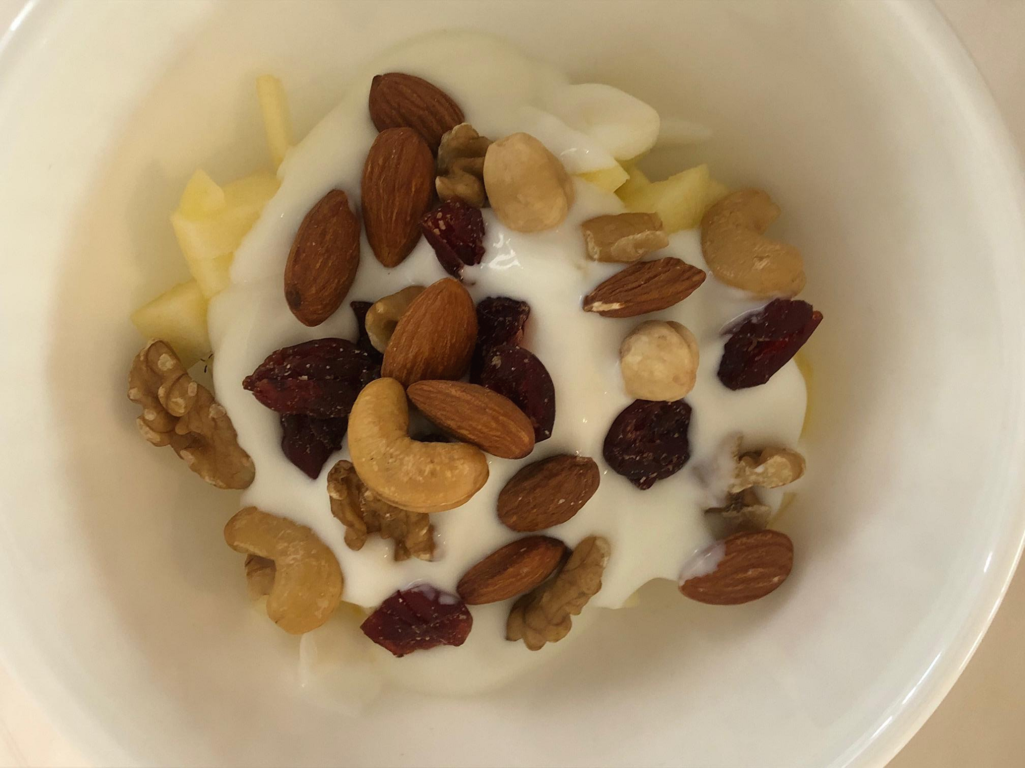 - "요거트 + 사과" (카카오닙스까지 뿌려먹으면 최고)