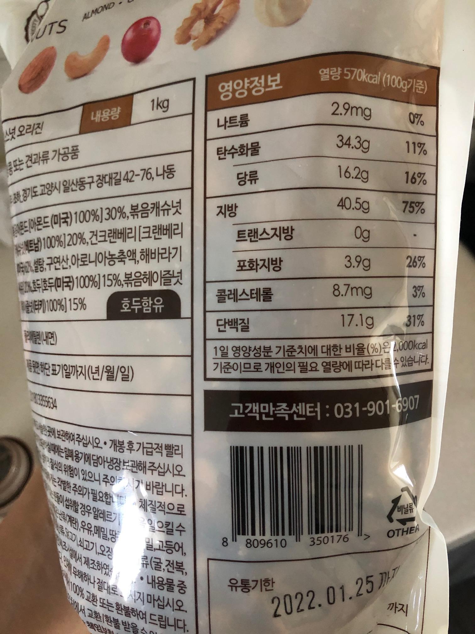 구성 : 5가지 (볶음아몬드 30%, 볶음개슈넛 20%, 건크린베리 20%, 호두 15%, 볶음헤이즐넛 15%)