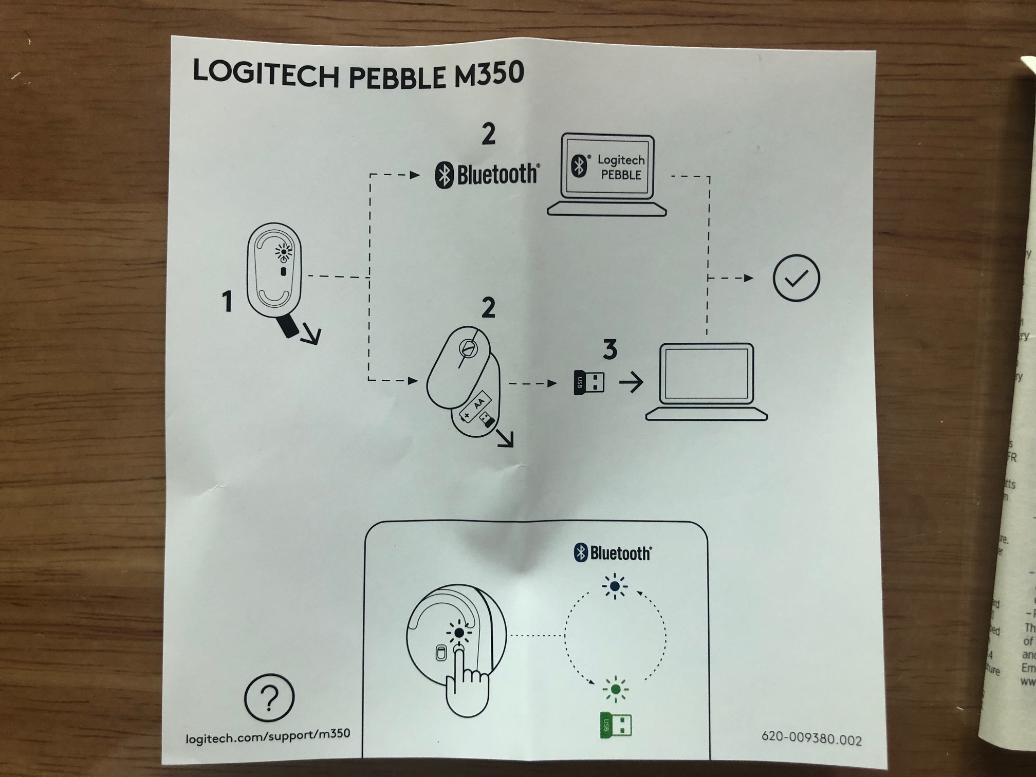 박스를 열면 마우스와 매뉴얼 3개가 동봉되어 있습니다. 매뉴얼 중에 2개는 필요가 없고 사용설명서가 그림으로 되어있어서 누구나 알아보기 쉽습니다. 동글 / 블루투스 연결이 각 1개씩 되고 하단부의 버튼을 눌러서 전환한다는 내용입니다.
