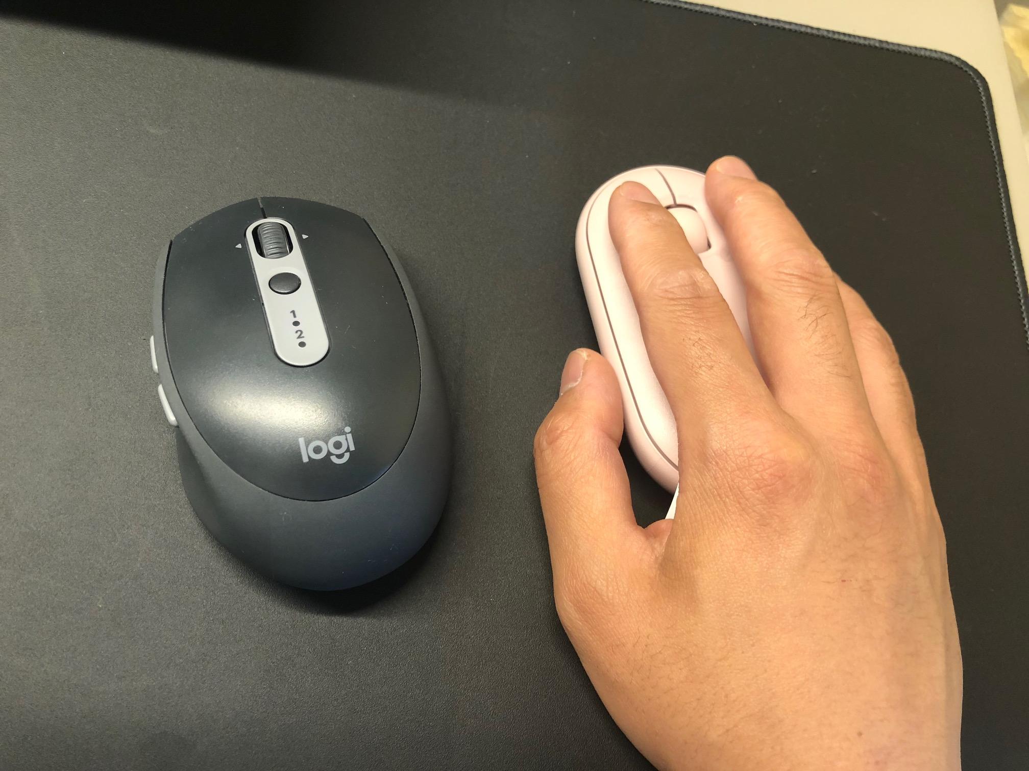 위에서 봤을 때 전체적인 크기는 비슷합니다. 오히려 길이는 M350이 조금 더 깁니다. 하지만 옆에서 보면 M350의 높이가 현저하게 낮다는 것을 알 수 있습니다. 길이가 긴 것은 크게 느껴지질 않았는데 높이 자체가 낮으니 마우스를 잡는 느낌이 기존의 그것과는 조금 달랐습니다.