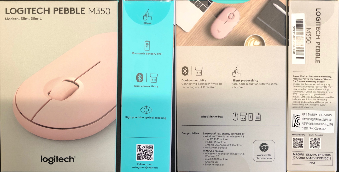 박스는 여느 마우스 박스와 같이 네모난 조그마한 박스입니다. 특별한 것은 없고 전면에는 로지텍 페블 상품명이 기재돼 있고 박스만 봐도 색을 알 수 있도록 핑크색 마우스 사진이 있습니다. 옆면에는 특징을 나타내 주는데요. 저소음, 배터리 사용시간, 블루투스 / 동글 연결 등 작지만 알찬 기능이 포함되어 있습니다.