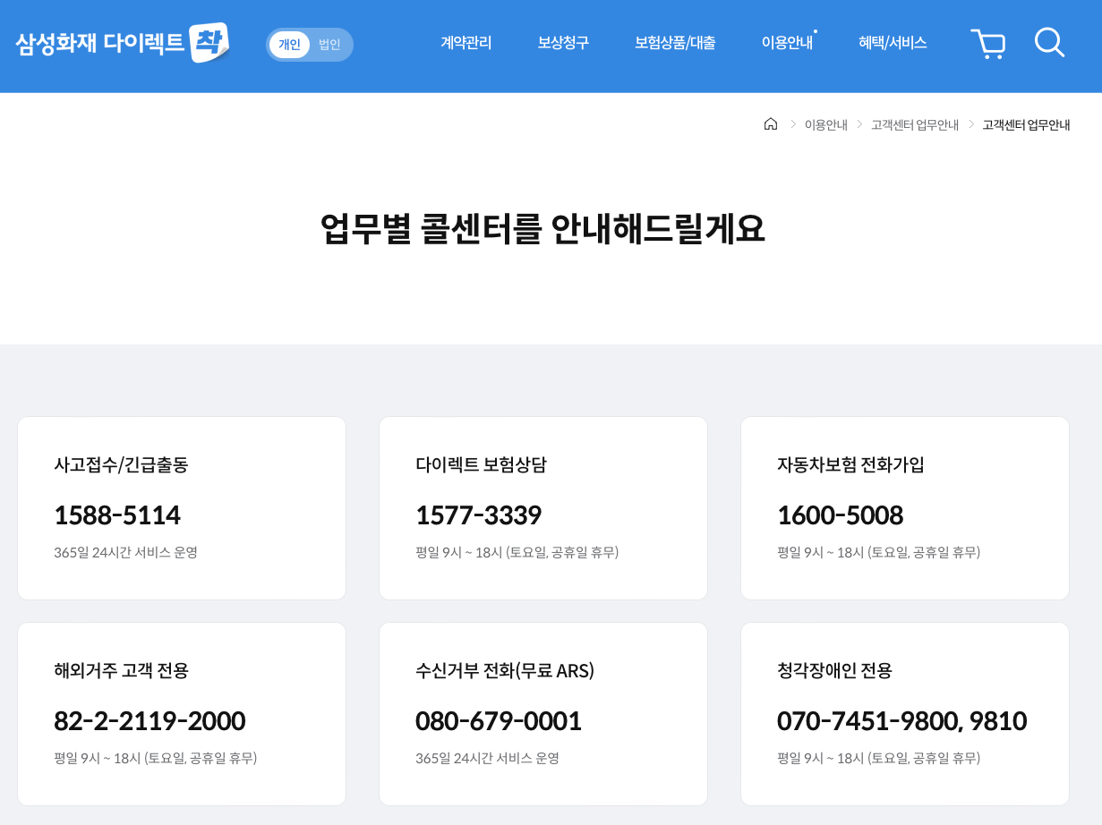 고객센터라고 해서 QnA 같은건 없고 사고접수와 상담 전화번호 안내 위주로 작성되어 있습니다.