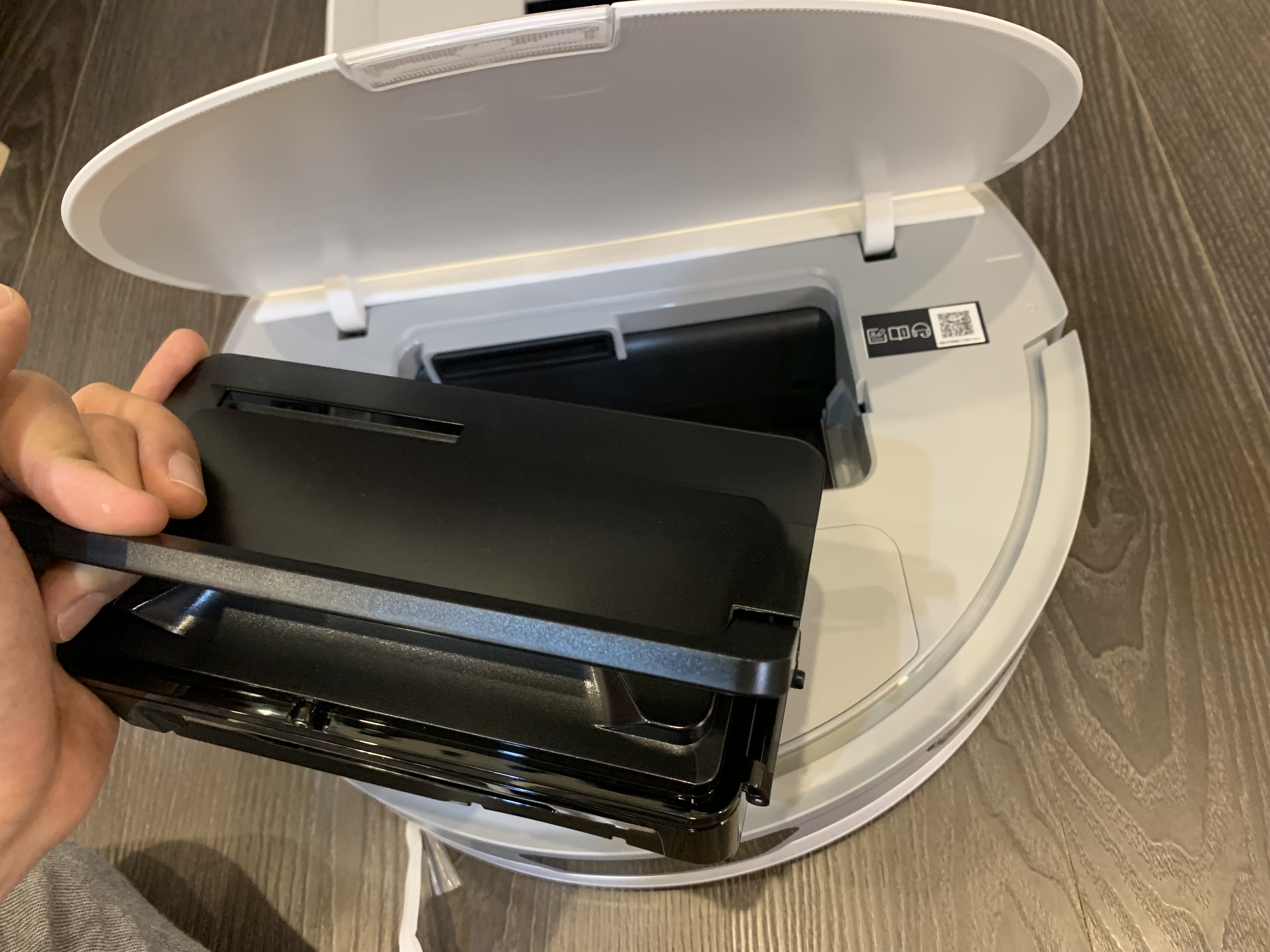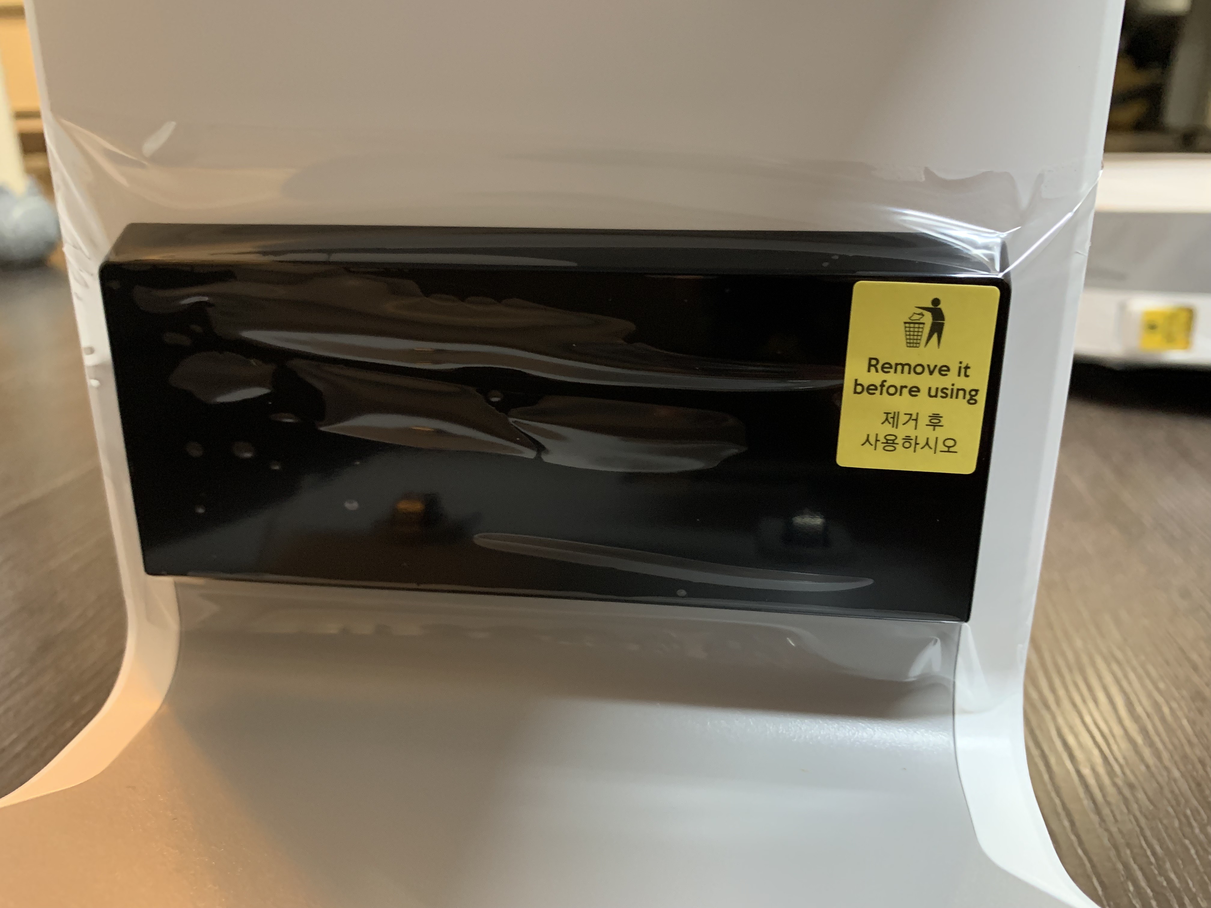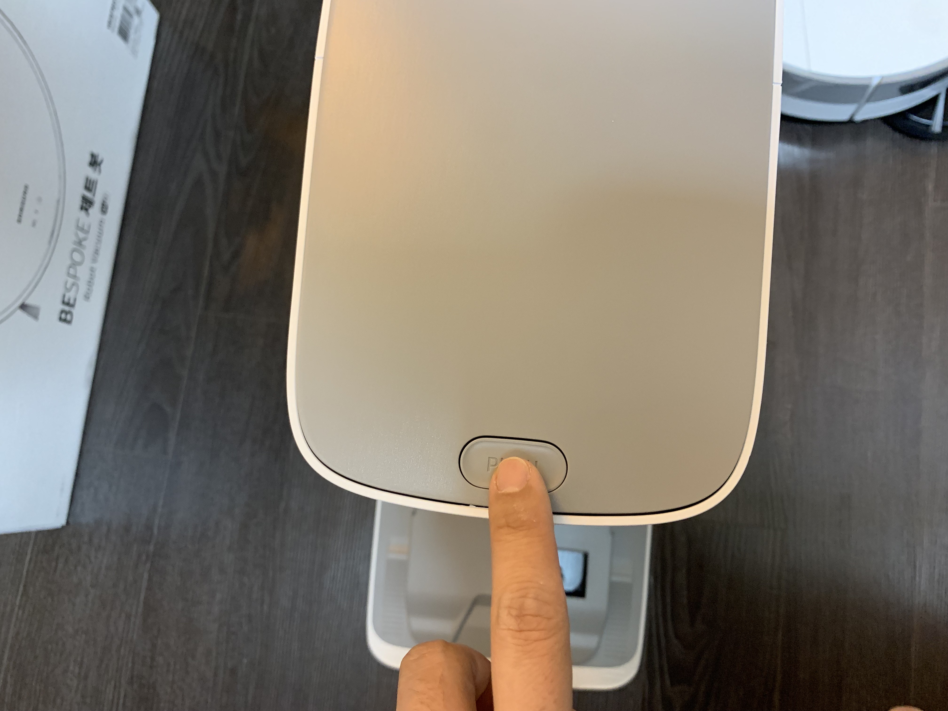 상부에는 푸시 버튼을 눌러 먼지통을 설치해주고 아래 청소기와 결합되는 센서부는 비닐을 뜯어줍니다.