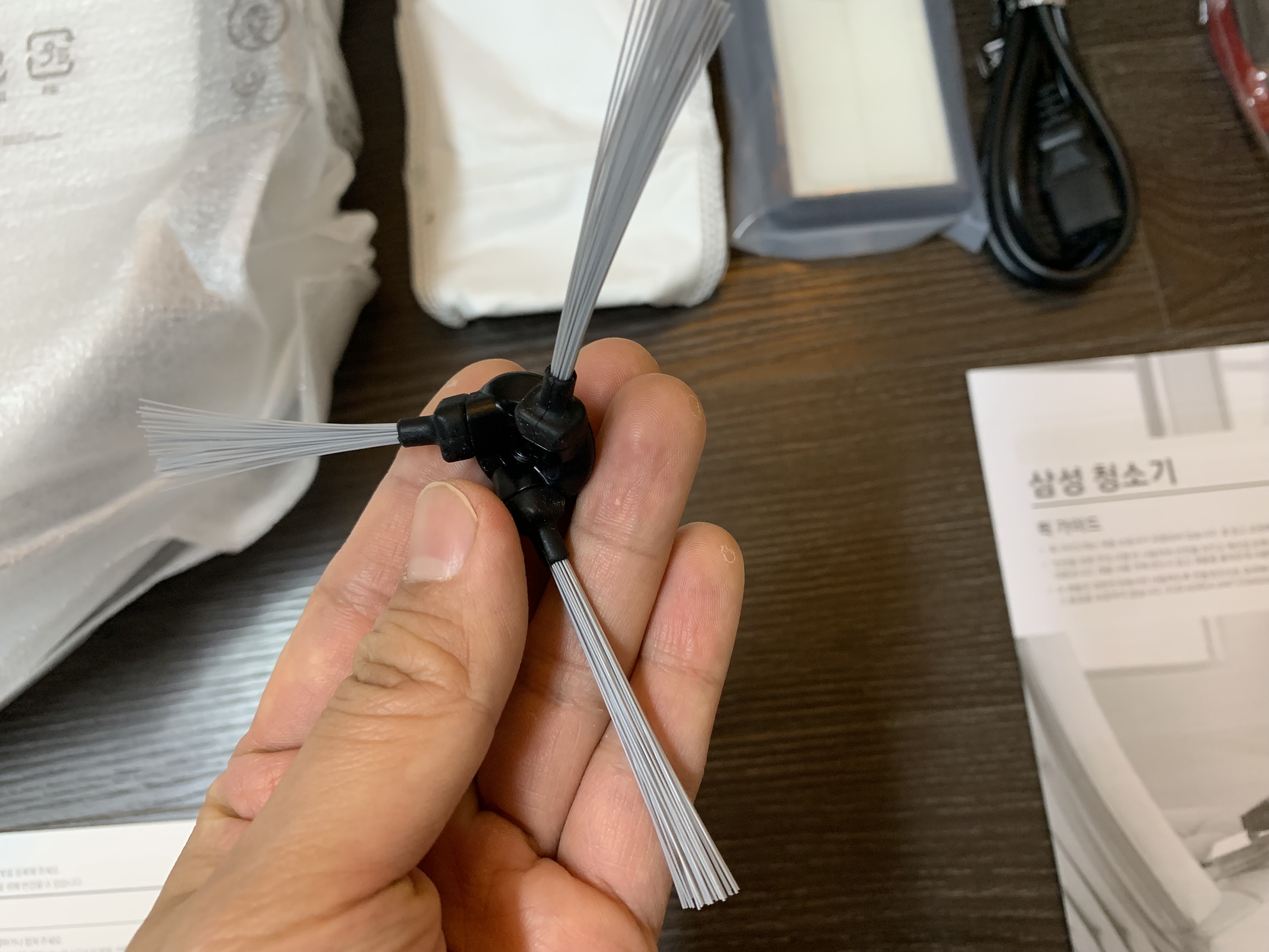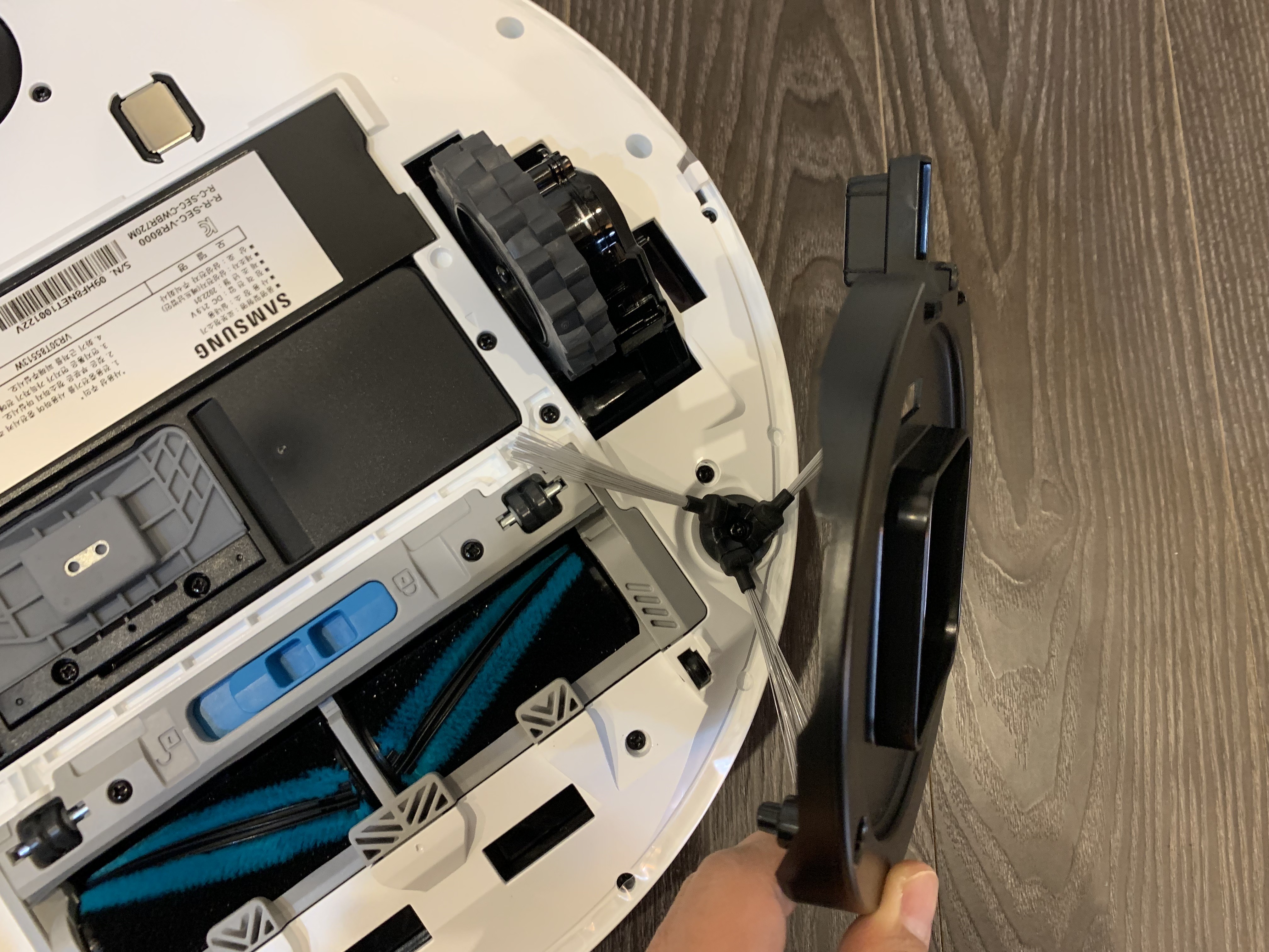 마지막 단점은... 단점이라기보다 사용을 위한 유지관리 정도로 보시면 좋을 것 같습니다. 제품이 움직일 때 본체에 붙어있는 3단 브러시가 돌아가면서 먼지를 흡입하는데요. 다이슨 같이 큰 구멍으로 먼지를 흡입하는게 아니라 돌아가는 브러쉬가 먼지와 머리카락을 모아서 빨아들이는 방식이다 보니 머리카락이 브러쉬에 걸려서 나중엔 브러쉬 속도가 조금씩 느려지기도 합니다. 속도가 느려지면 당연히 배터리 성능에도 문제가 될 수 있으니 한 1~2주일을 기준으로 한 번씩 머리카락을 제거해 주시면 더욱 쾌적하게 청소기를 사용할 수 있습니다.