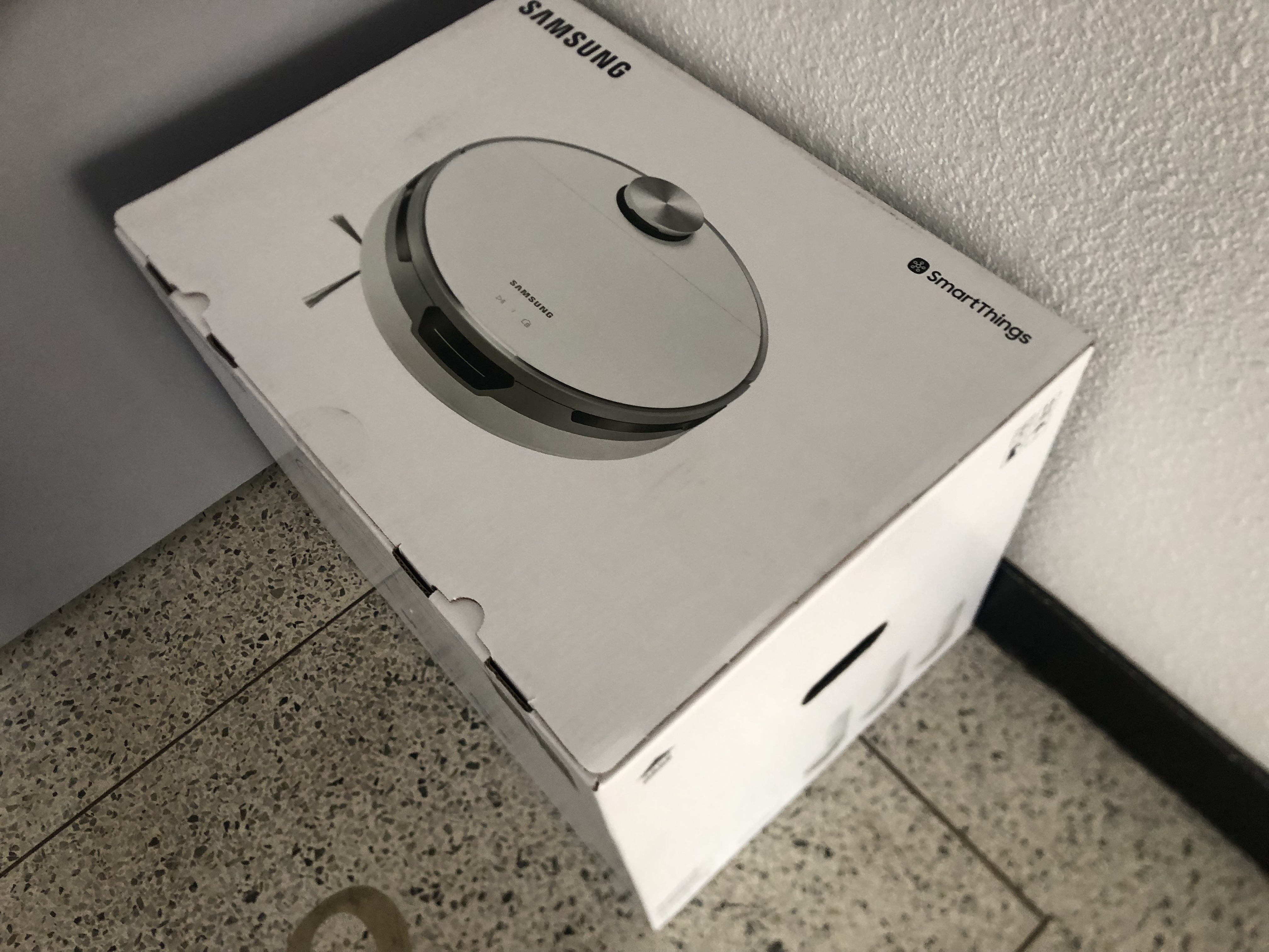 자! 드디어 택배가 도착했습니다. 생각보다 큰 사이즈의 택배로 두 손을 벌려 좁은 문으로 조심히 가지고 들어왔습니다. 아래는 배송 오자마자 찍은 따뜻한 사진입니다. 삼성 제트봇을 구매하면 택배로 보내는 것이 아니라 삼성에서 문 앞으로 직접 배송을 해줍니다.