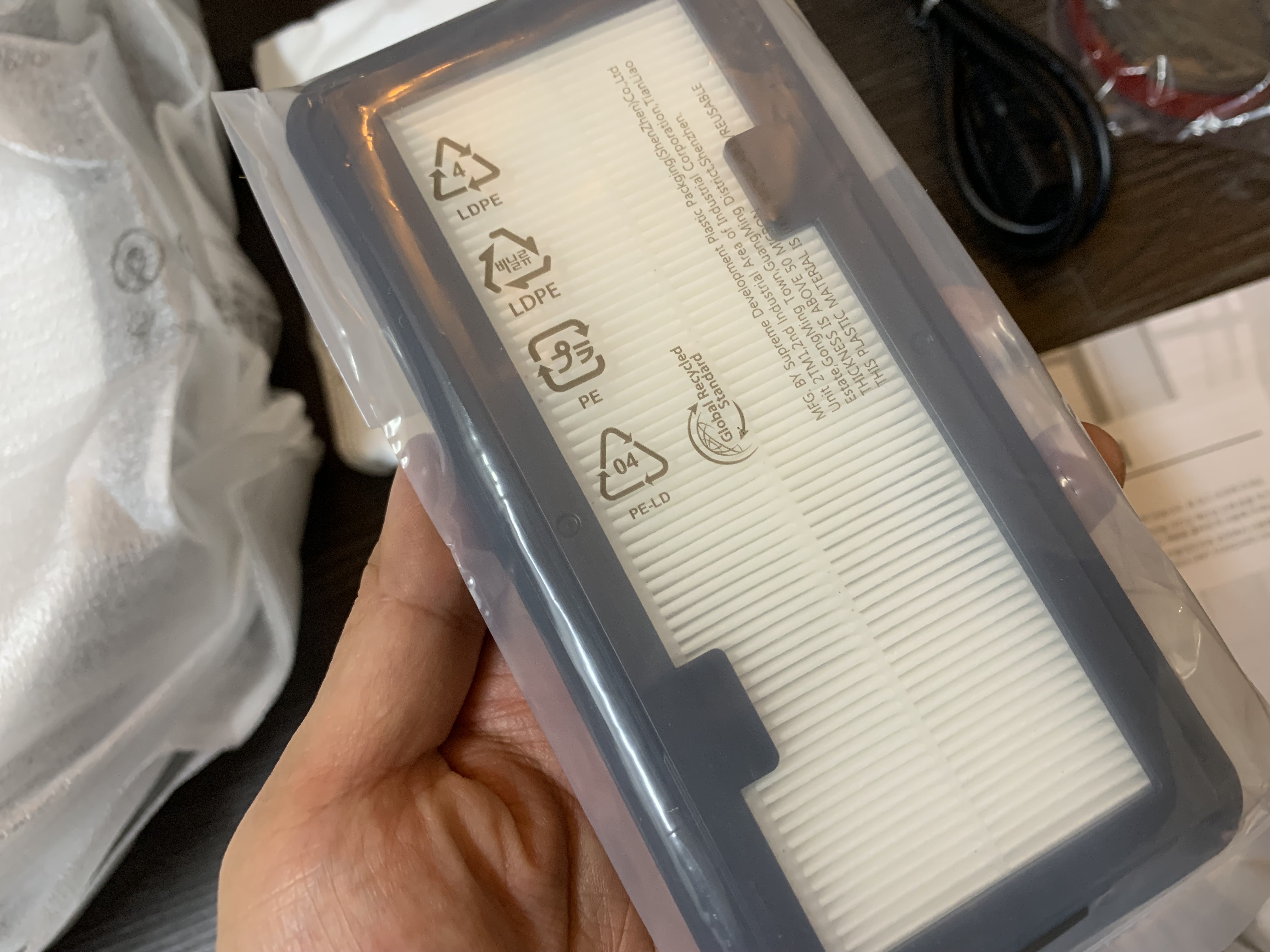 포장을 열어보면 제일 위에 청소기 본체가 보이고요. 하나씩 꺼낼 때마다 연결선, 필터, 가장 아래에 충전기 및 먼지통이 위치해 있습니다.