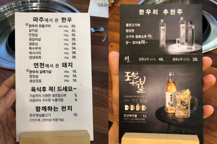메뉴입니다. 파주에서 온 한우와 연천에서 온 돼지를 사용하신다고 합니다. 한우는 모둠구이부터 양념 육회까지 8가지 메뉴가 있고 돼지는 갈매기살, 항정살, 생삼겹살만 판매하고 있습니다.