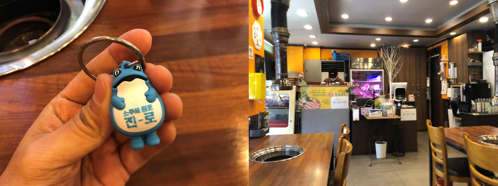 매장에 들어와 자리에 앉으니 외투는 사물함에 보관하라고 말씀해 주시네요. 우측 사진 하얀 모형 나무 옆에 있는 게 사물함입니다. 테이블 별로 외투를 넣어놓고 열쇠는 빼서 보관하다가 다 먹고 나갈 때 다시 입고 나가면 됩니다. 고깃집이라 냄새가 옷에 배는데 세심한 배려가 느껴집니다.