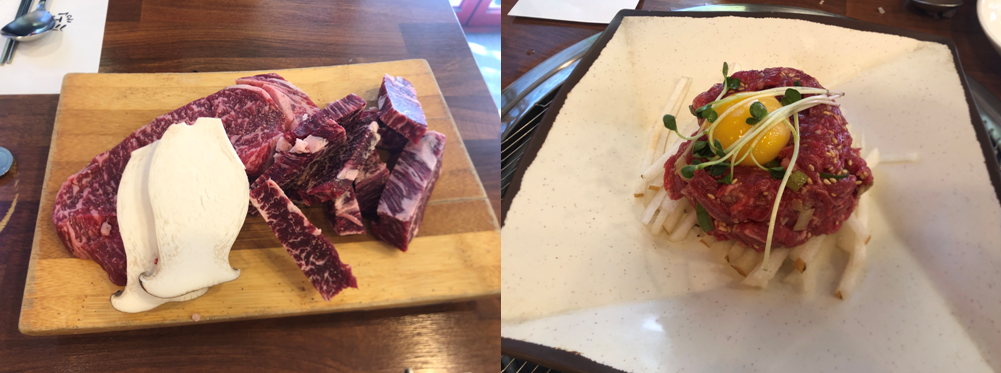 안창살, 생등심, 양념 육회 모습입니다. 이렇게 다시 봐도 맛있어 보입니다. 왼쪽 사진에 빨갛게 덩어리도 되어있는 게 생등심이고 검붉으면서 잘라져 있는 게 안창살입니다. 양념 육회는 고기를 다 먹고 나왔는데요. 배, 육회, 노른자, 무순의 조합이 좋았습니다. 양념이 많이 세지 않으면서 맛을 잘 잡았다는 느낌이 있었습니다.