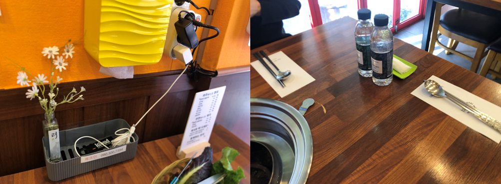 테이블에 앉으면 벽 쪽에는 핸드폰을 충전할 수 있는 충전기가 별도로 있습니다. 보통 가게 카운터에 충전을 맡기곤 하는데 테이블에 충전기가 있어 배터리가 부족하신 분들은 편리하게 이용할 수 있을 것 같습니다.