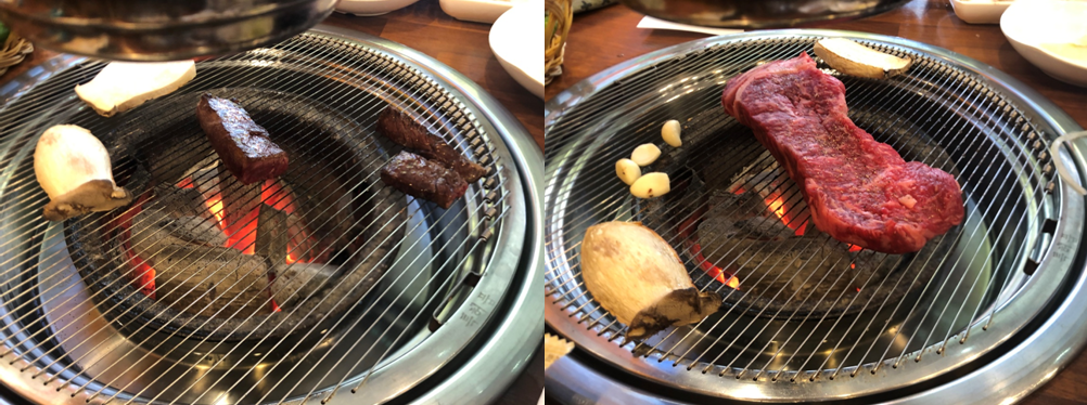 고기를 구워봤습니다. 왼쪽이 안창살, 우측이 생등심입니다. 안창살을 먹고 생등심을 먹었는데요. 안창살은 부드러우면서 육향이 진하게 느껴졌고, 생등심은 씹는 맛이 조금 느껴지면서 한우의 고소함이 입안에 가득한 맛이었습니다. 결론적으로 둘 다 맛있었습니다. 특히 안창살이 정말 맛있었습니다. 물론 한우 안창살이 맛이 없을 수 없지만, 갑자기 방문한 불광동, 그것도 계획 없이 들어간 한우집에서 맛있는 고기가 나와서 그런지 참 고마웠습니다.