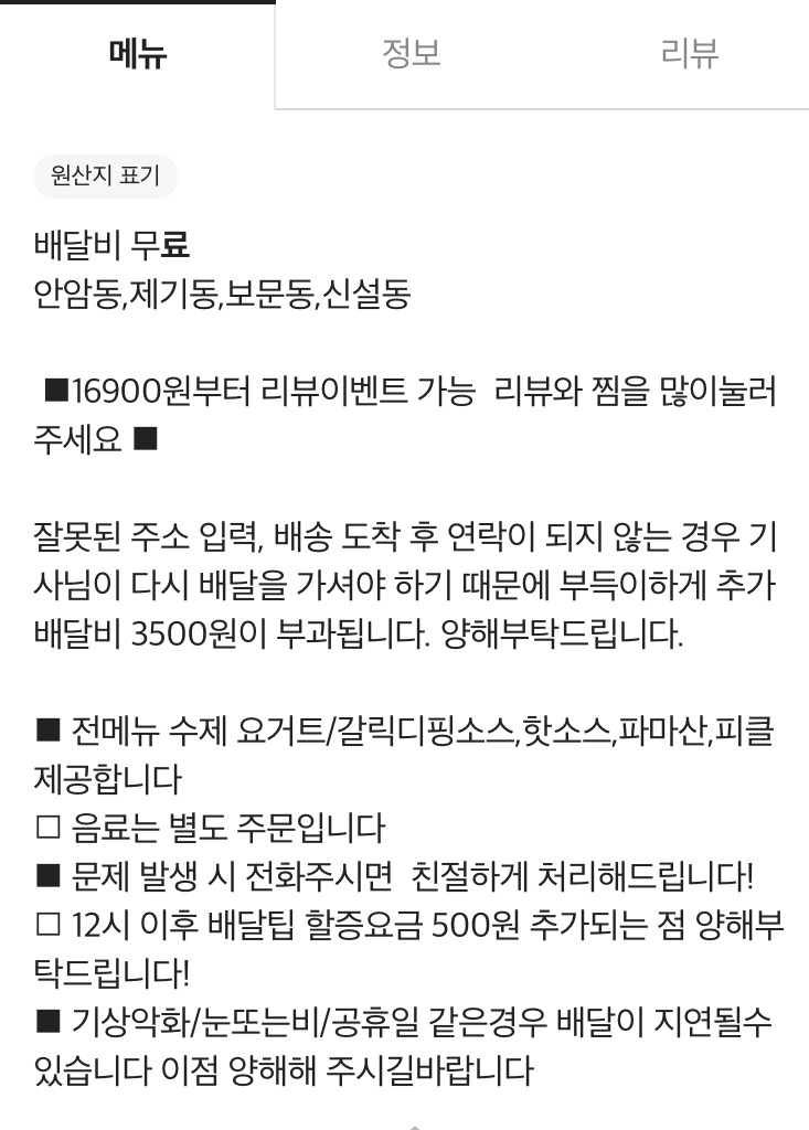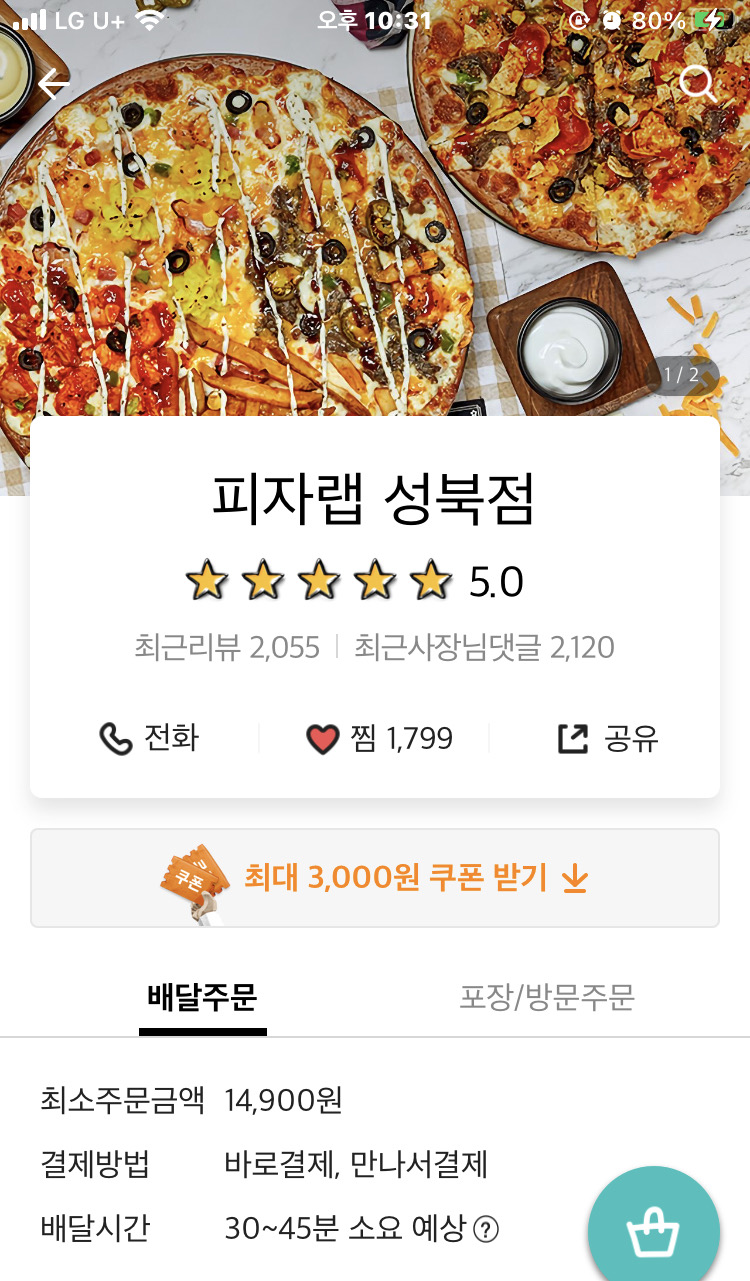 주문은 배민에서만 할 수 있는데요. 아래 글에서는 배민에 올라가 있는 피자랩 성북점의 영업정보와 서두에서 언급한 리뷰 이벤트에 대해서 자세하게 알려드리겠습니다.
