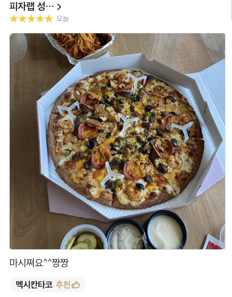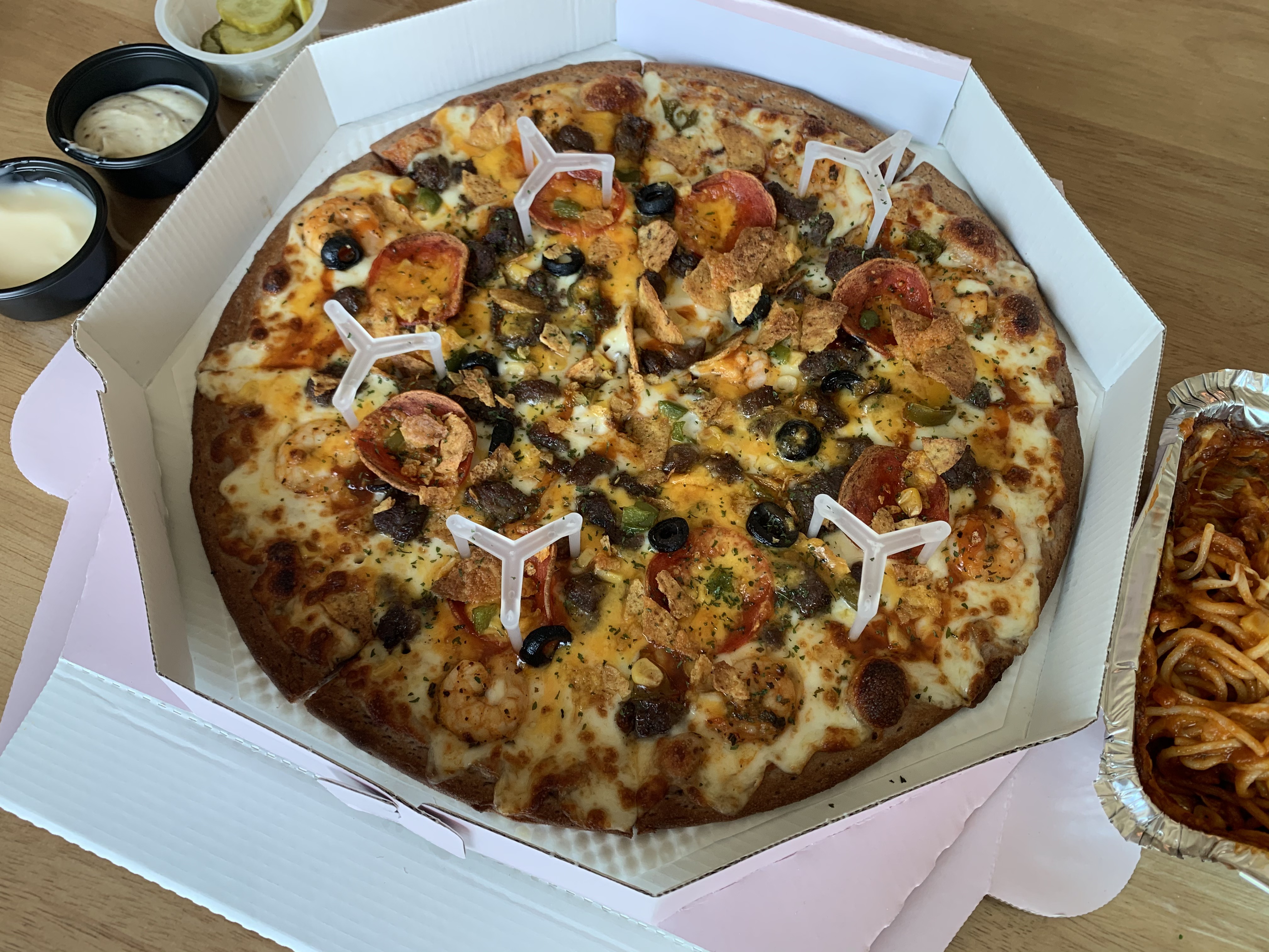 맛있음이 느껴지시나요? 오늘은 직계가족과 모임이 있어서 라지(L) 2판을 시켰습니다. 아이들은 쉬림프 골드, 어른들은 멕시칸 타코. 몇 번을 같은 메뉴를 시키는데요 질리지 않고 먹을 때마다 맛있는 게 참 고마운 일인 것 같습니다. 위의 멕시칸 타코 메뉴 사진을 보면 우측에 오븐 스파게티 사진도 있는데요 이건 일정 금액 이상 주문했을 시 리뷰 이벤트로 신청할 수 있습니다. 보통 라지 사이즈 한판만 시켜도 리뷰 이벤트를 신청할 수 있으니 가성비 역시 최고 수준입니다.