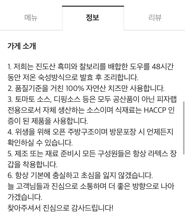 제가 서두에 이 집 도우가 적당하다고 표현했던 거 기억하시나요? 진도산 흑미와 찰보리를 배합한 도우를 48시간 저온 숙성 방식으로 발효 후 조리한다고 합니다. 뿐만 아니라 자연산 치즈도 사용하고 소스도 자체 생산하고 있다고 하네요. 배달 전용 매장이라 홀에서 먹을 수는 없습니다. 하지만 포장 방문으로 몇 번 방문해 보았는데 위생적인 면에서 거슬리는 부분은 전혀 없었습니다. 오히려 깨끗하게 관리되는 느낌이었고 주문이 1분에 몇 개씩 밀려들어오는 모습만 보였습니다.