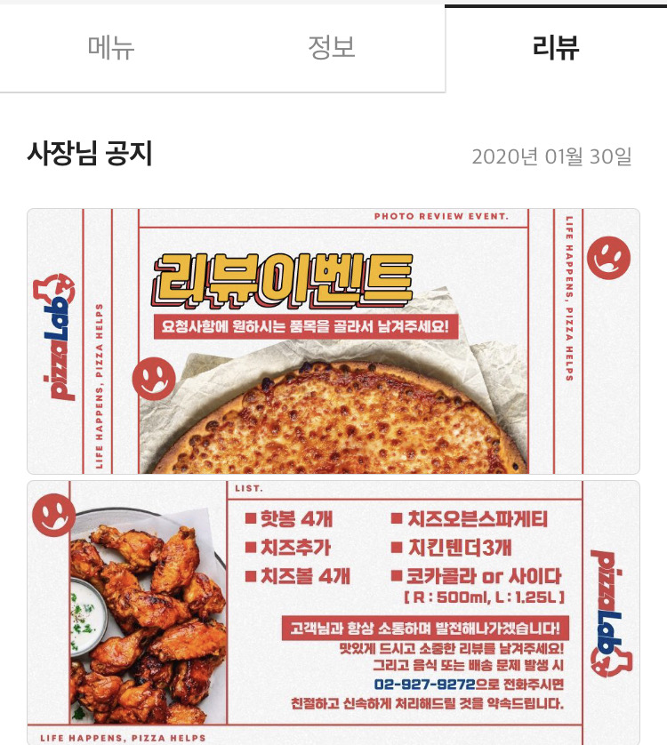 보통 라지 사이즈 피자를 주문하면 작은 캔의 콜라가 하나 정도 같이 옵니다. 그런데 이곳은 일정 금액 이상 주문하면 리뷰 이벤트라고 6가지의 음식이나 음료 중 하나를 고를 수 있습니다. 일정 금액이란 게 16,900원부터이고 라지 사이즈 피자가 한판에 약 19,000원 정도이니 피자를 한판 시키면 무조건 리뷰 이벤트를 신청할 수 있습니다. 자세한 내용은 아래에 피자랩 소개에서 알려드리겠습니다.