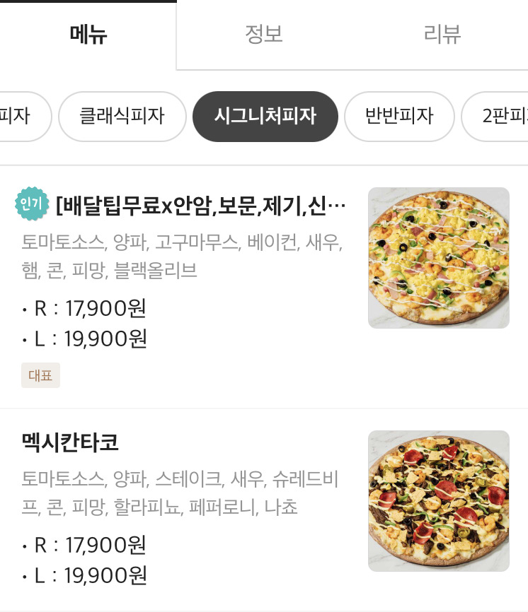 메뉴는 없는 것 빼고 다 있습니다. 콰트로, 클래식, 시그니처, 반반 피자 등 등 종류가 많은데요 저희는 항상 시그니처 피자를 먹습니다. 리뷰 이벤트도 하고 아이들이 시그니처 피자 중에 쉬림프 골드를 가장 좋아해서입니다.