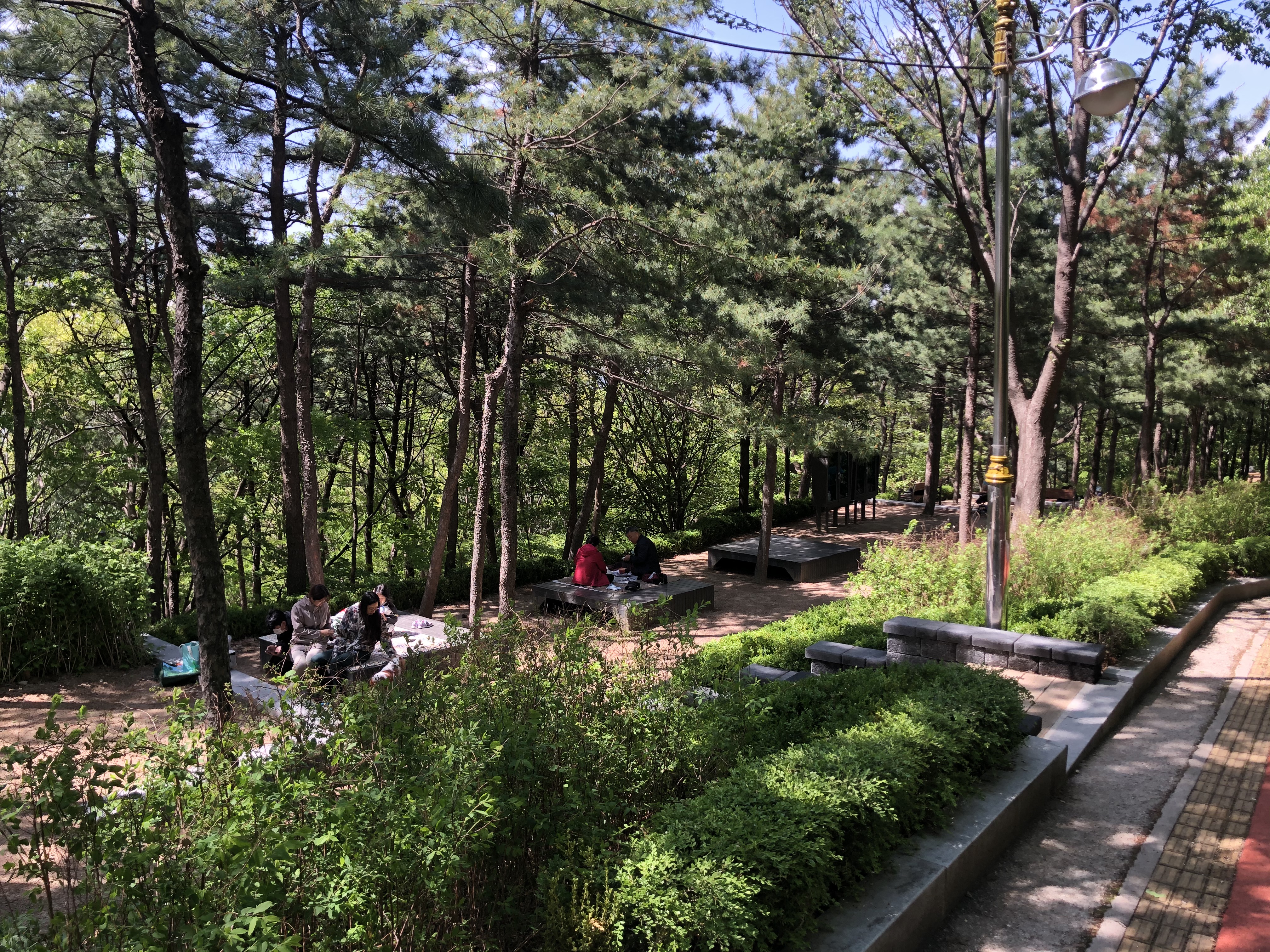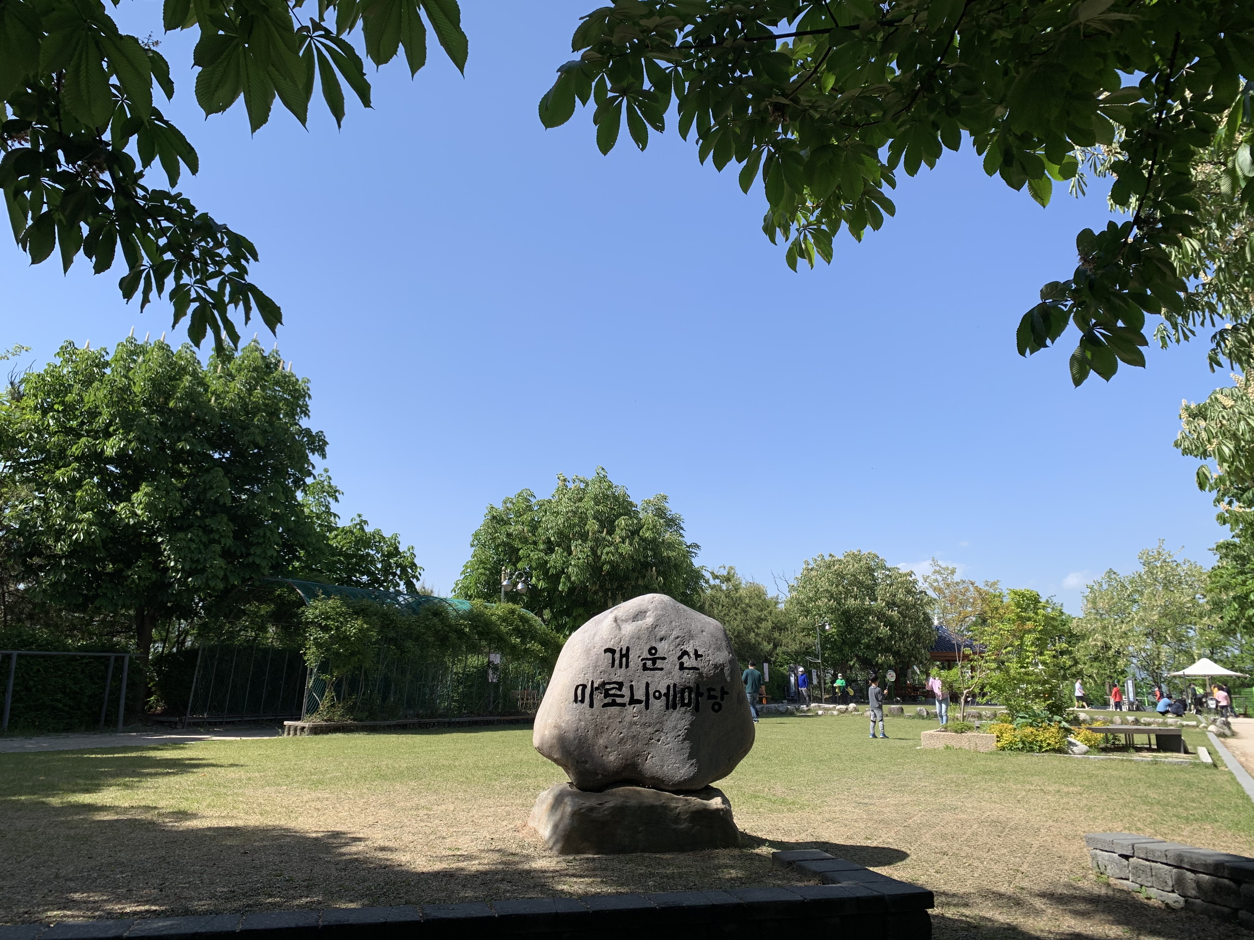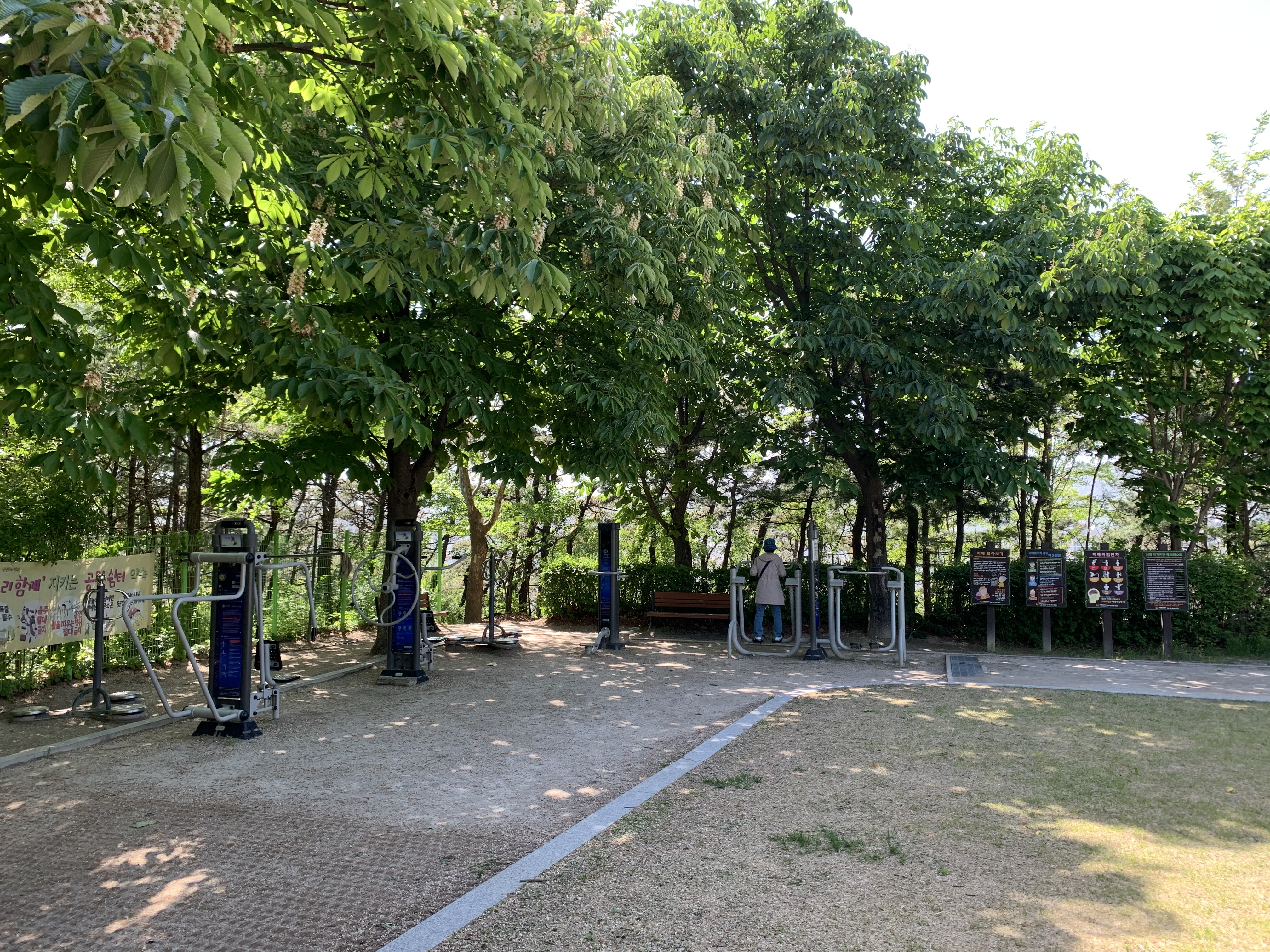 유아 숲 체험장이 각개 전투장이었다면 여기는 연병장이다. 엄청 넓은 운동장은 아니지만 중간에 잔디밭이 있고 외곽으로는 걸을 수 있는 길과 운동기구가 있어서 어르신들이 돌면서 운동하는 곳이다. 잔디밭에서는 초등학생쯤 되는 아이들과 부모들이 배드민턴도 치고 미쳐 준비하지 못하는 아이들은 잡기 놀이를 하며 뛰어다닌다. 어른들은 그런 아이들을 보면서 외곽 길을 걷는다. 이곳은 개운산의 꼭대기라서 다른 곳에 비해 햇빛이 세다.