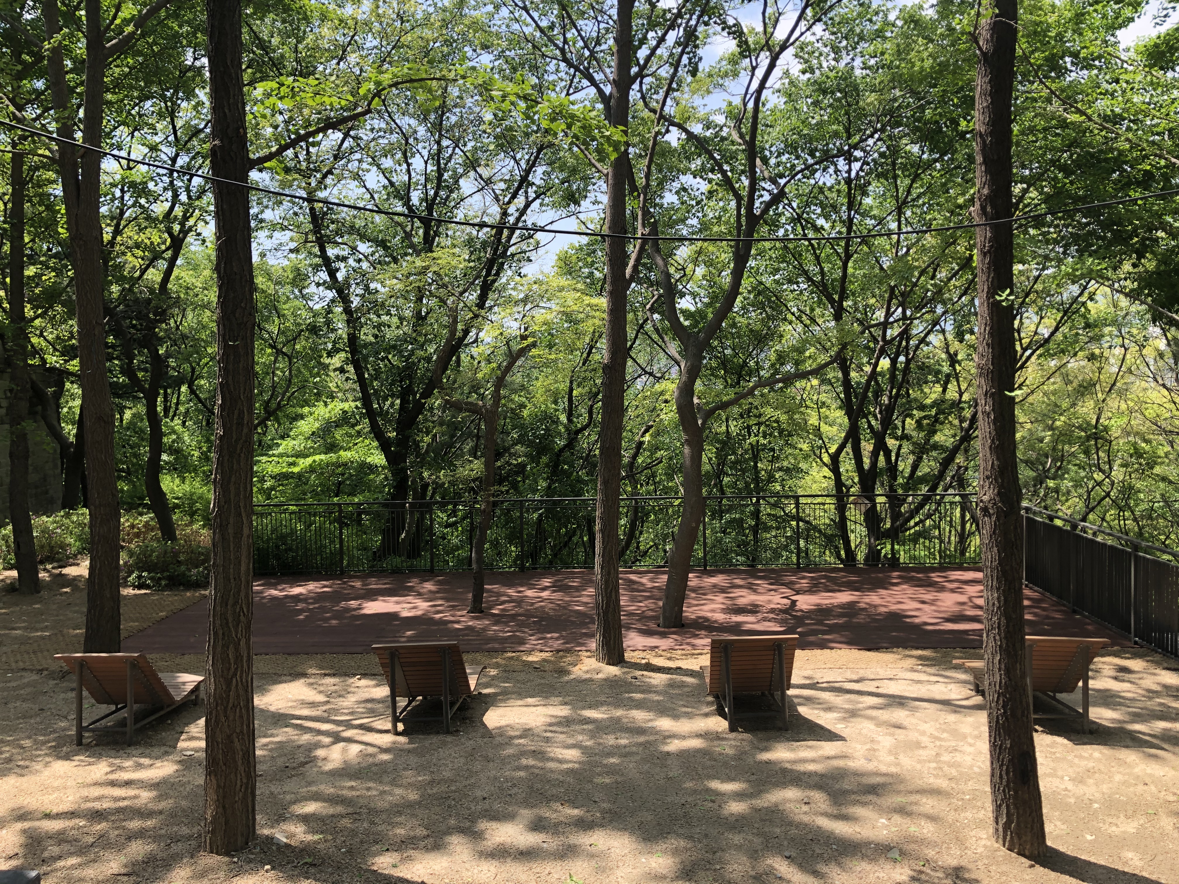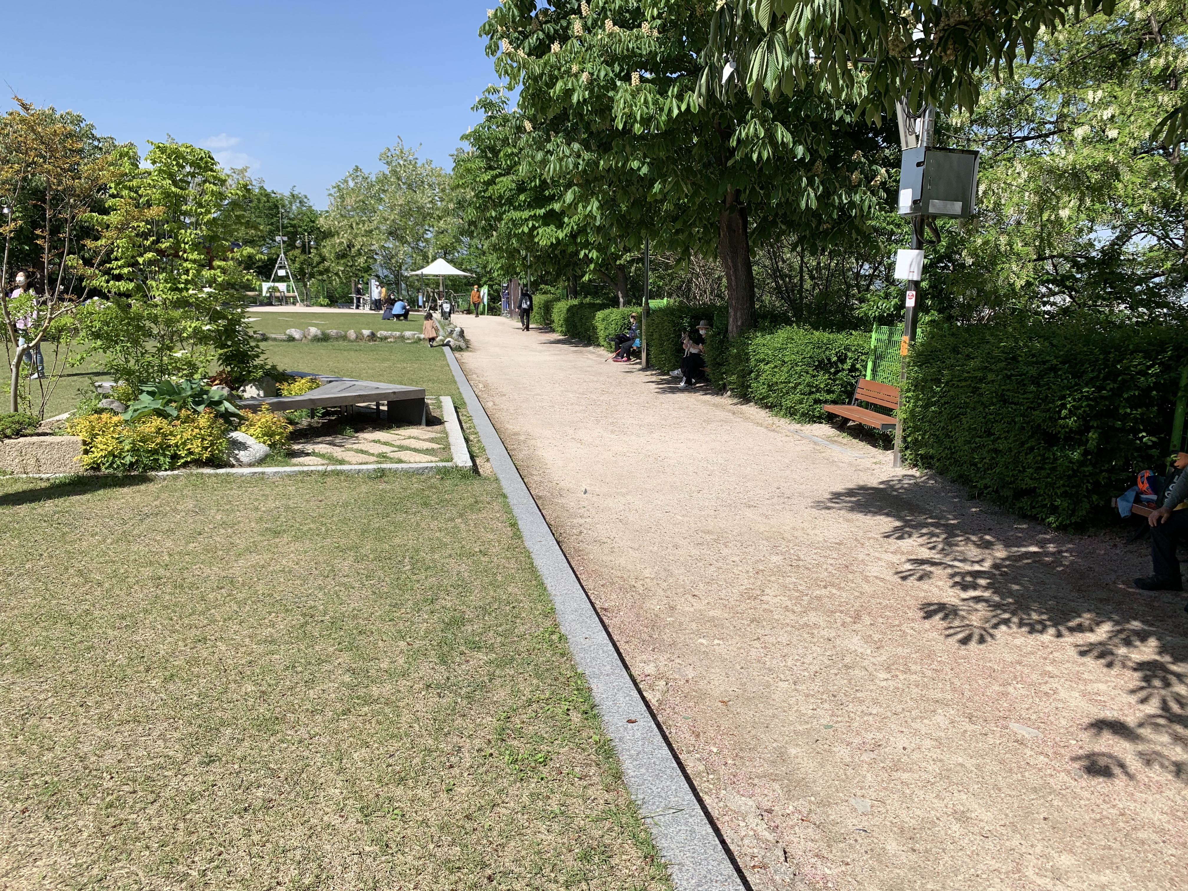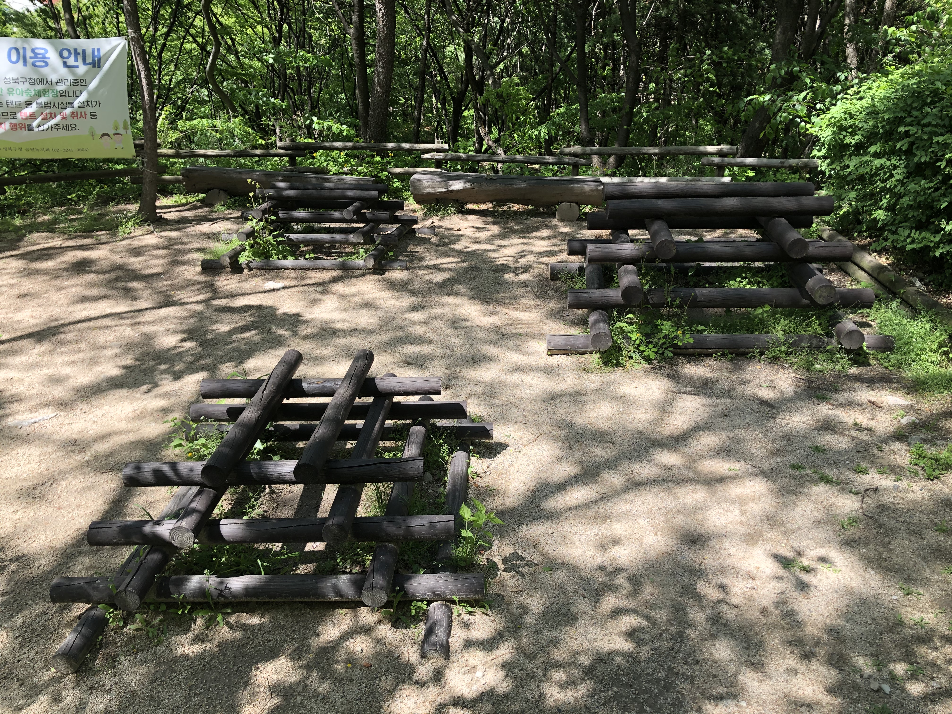 유아 숲 체험장이 각개 전투장이었다면 여기는 연병장이다. 엄청 넓은 운동장은 아니지만 중간에 잔디밭이 있고 외곽으로는 걸을 수 있는 길과 운동기구가 있어서 어르신들이 돌면서 운동하는 곳이다. 잔디밭에서는 초등학생쯤 되는 아이들과 부모들이 배드민턴도 치고 미쳐 준비하지 못하는 아이들은 잡기 놀이를 하며 뛰어다닌다. 어른들은 그런 아이들을 보면서 외곽 길을 걷는다. 이곳은 개운산의 꼭대기라서 다른 곳에 비해 햇빛이 세다.