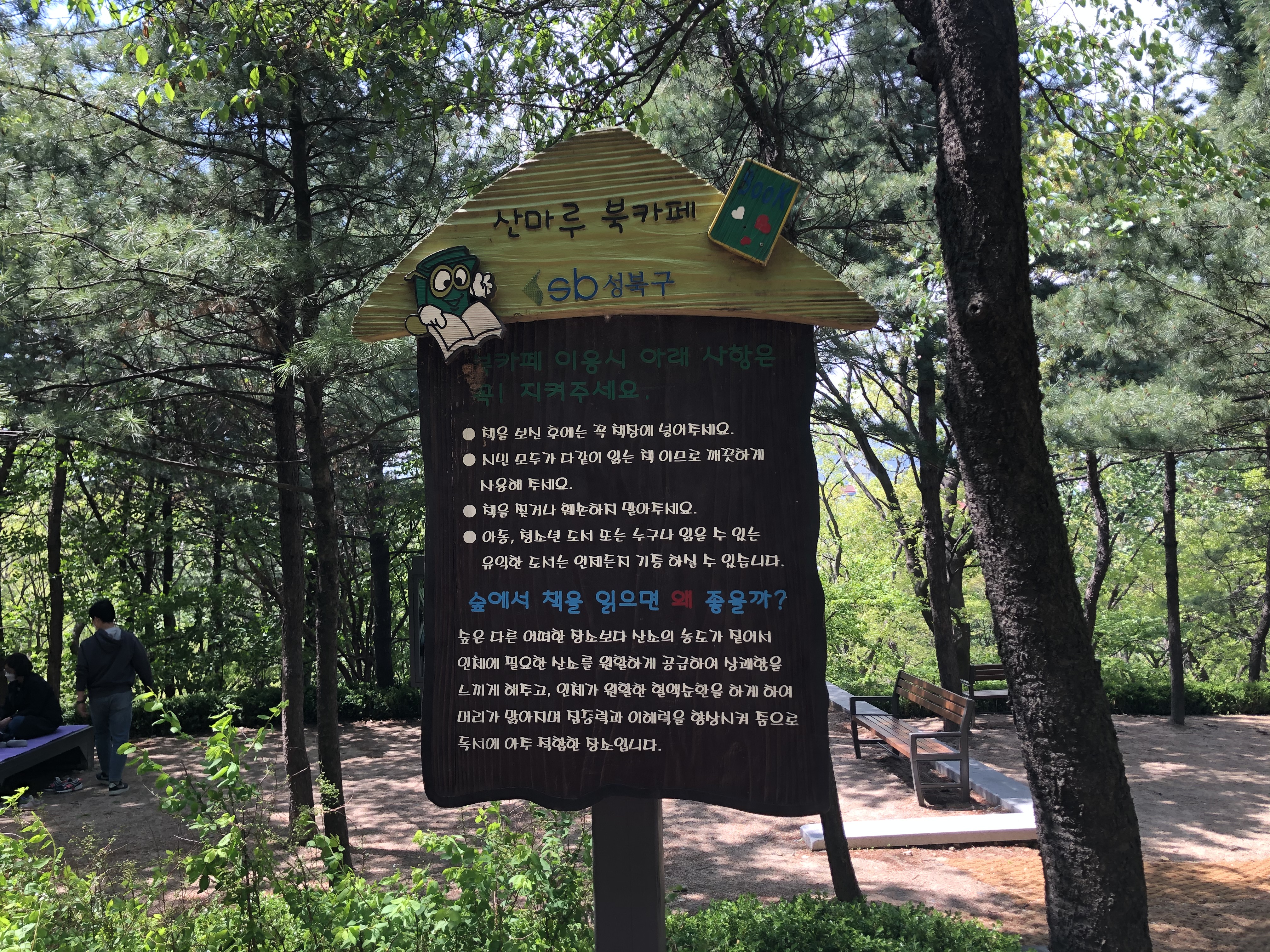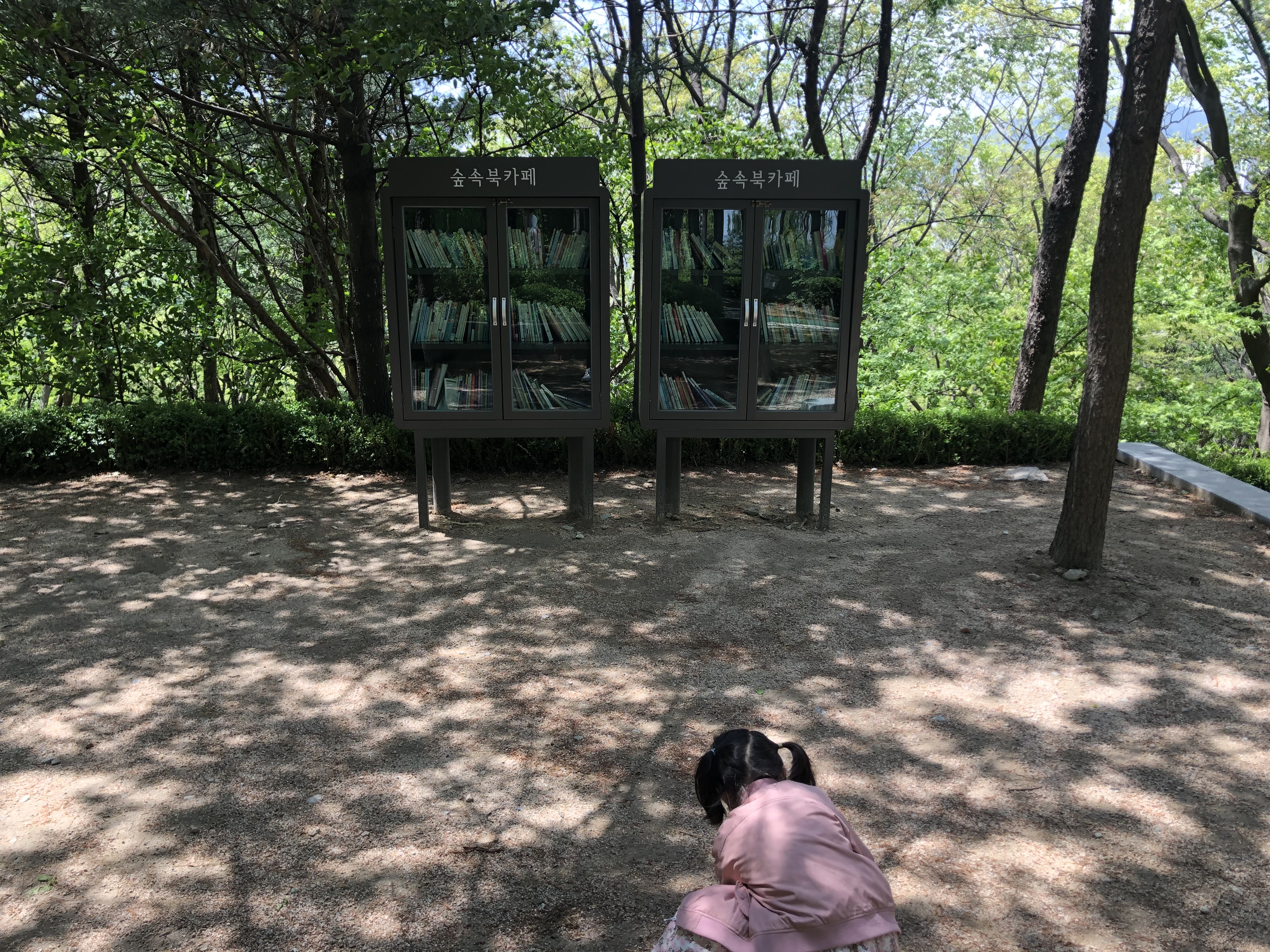 산속에 북카페가 있다고 해서 음료를 파는 카페가 있는 것은 아니다. 책장 안에 책이 있고 평상과 벤치가 있다. 이곳은 나무도 울창해서 따가운 햇빛을 막아주고 바람이 살랑살랑 분다. 책을 들고 벤치에 앉아 있으면 책도 잘 읽히지만 잠도 잘 온다. 책은 어른들용 책이 있고 동화책은 집에서 몇 권 가져오는 걸 추천한다. 필자는 주로 방문하자마자 책을 읽고 유아 숲 체험장을 들렀다가 마로니에 마당으로 가는데 요즘엔 아이들이 빨리 놀러 가자며 생략하는 경우가 많다. 그래도 언제나 편하게 앉아서 숲을 즐길 수 있는 곳이기에 추천한다.