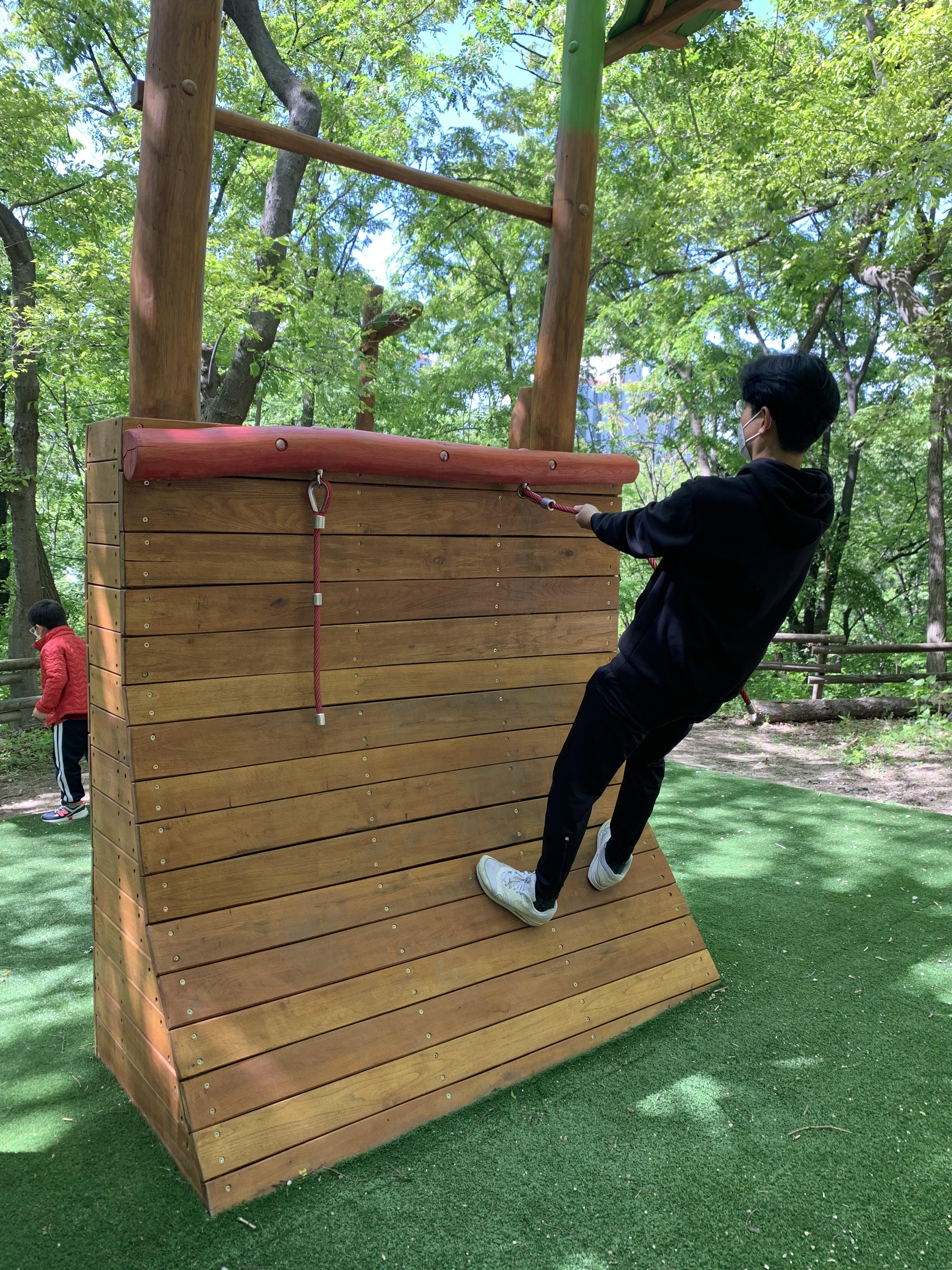 나무놀이터에서는 한 명씩 들어가서 자기 집이라면서 들락날락 거리며 놀고, 모험놀이터에서는 뛰기도 하고 밧줄을 잡고 경사로를 올라가기도 하고 사진 좌측에 보이는 통나무 집 같은 곳에 들어가서 숨바꼭질도 한다. 꼭 군대 시절 각개전투를 하던 장소가 떠오른다.