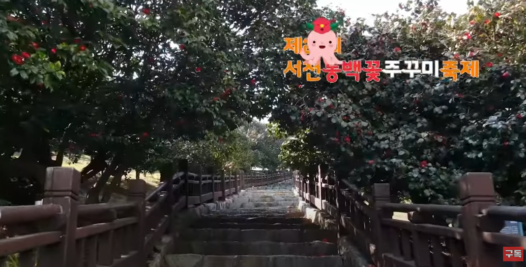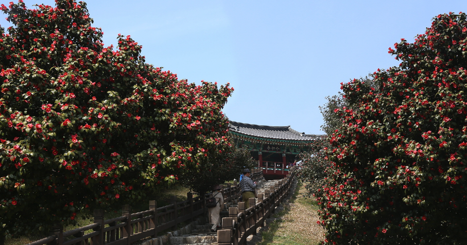먼저 동백정 동백나무 숲 전경입니다. 동백정을 올라가는 계단 양옆으로 붉은 동백꽃이 만발해 있습니다. 흔히 축제로는 벚꽃의 하얀 핑크색이 인기인데 이렇게 빨간 동백꽃도 그 매력이 충분한 것 같습니다. 실제로 방문해서 바람에 살랑이는 꽃내음을 맡으면 기분이 어떨지 정말 기대됩니다.