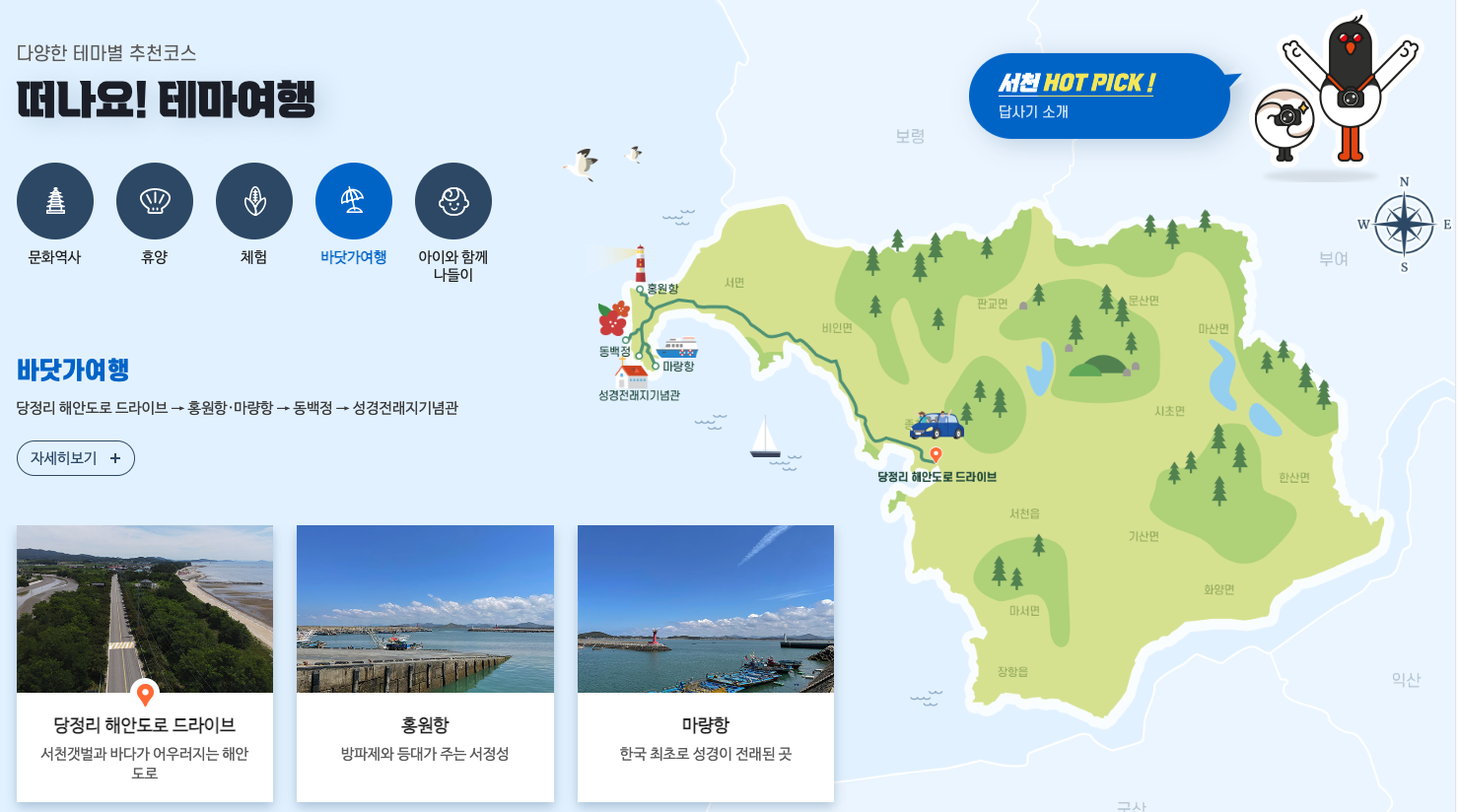 서천군청 홈페이지에 서천의 테마별 추천코스가 자세히 나와있습니다. 그 대표적인 몇 가지를 소개해 드리겠습니다. 역시 여행은 그 지역의 홈페이지를 방문하는 것에서부터 시작인 것 같습니다.