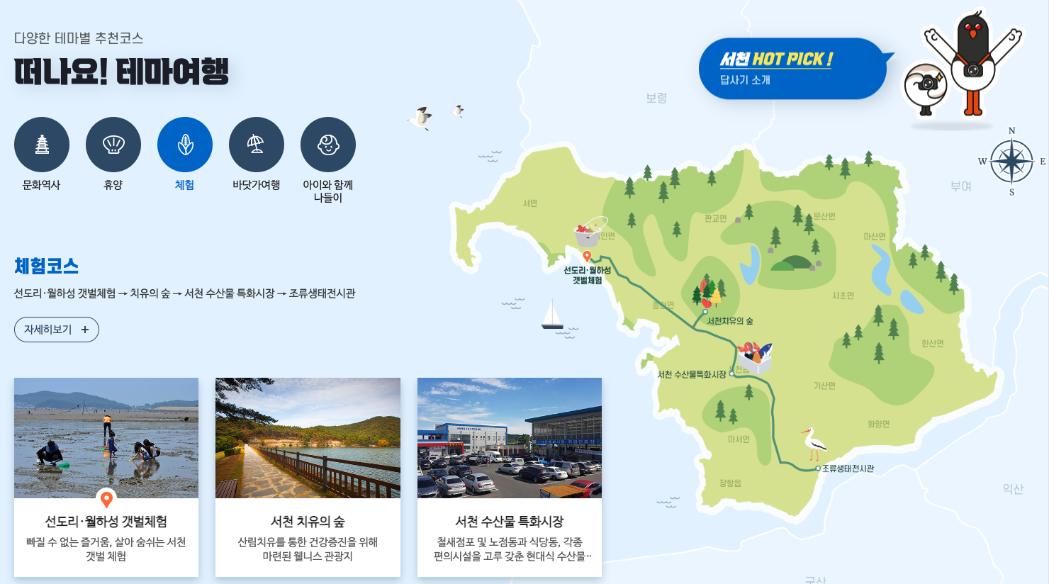 체험코스입니다. 갯벌체험에서 수산물 특화시장 조류생태 전시관까지 서천의 바닷가와 특산물을 체험하기 딱 좋을 것 같습니다.
