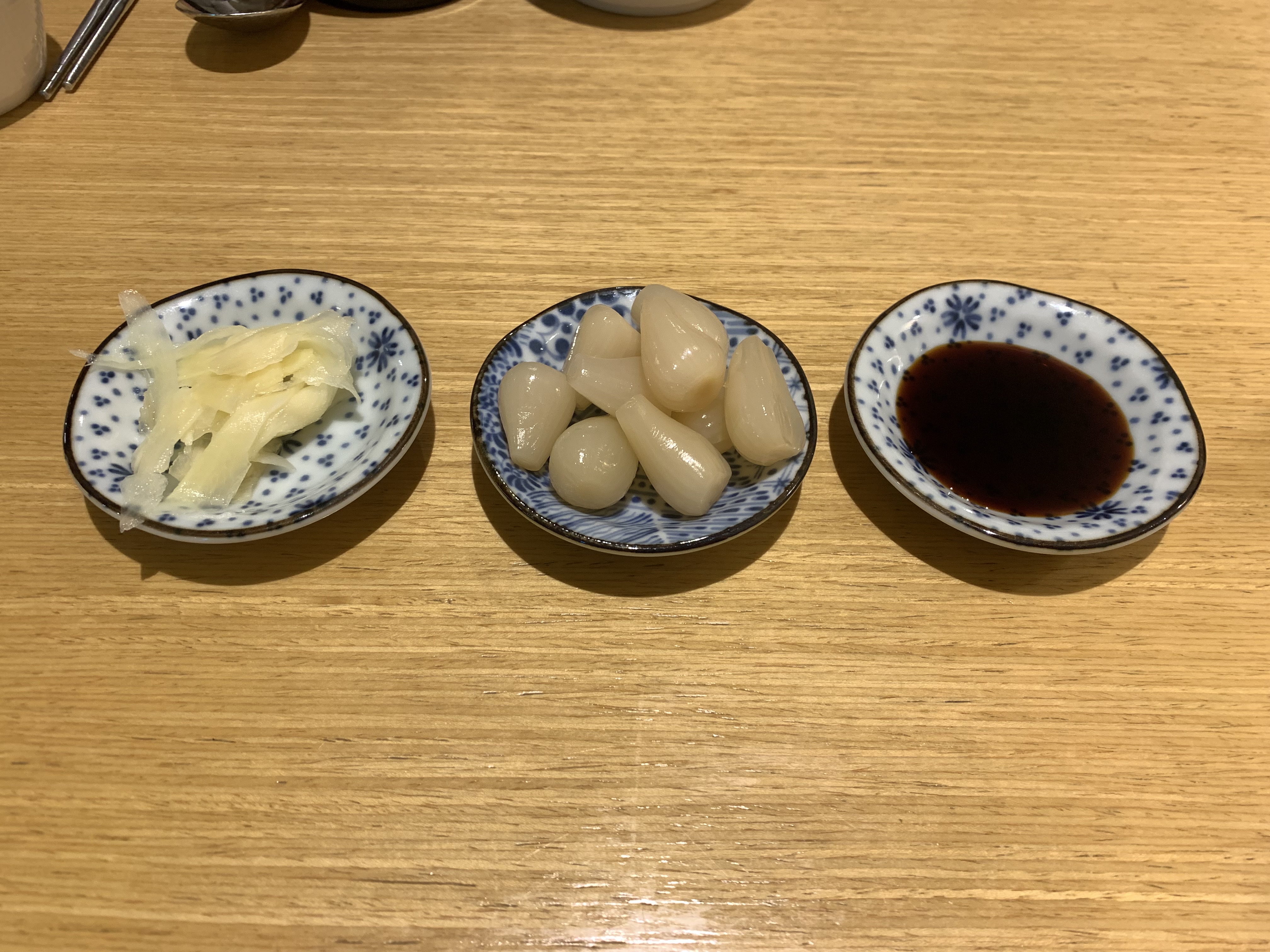 아래 사진은 기본 구성인 죽과 된장국, 그리고 모든 일식집에 있는 생강, 약교, 간장입니다. 스시진에 방문하면서 가장 좋았던 것 중에 하나가 바로 이것인데 정말 신기하게도 생강과 간장이 정말 맛있습니다. 생강은 그냥 시큼한 맛이 아니라, 새콤하면서 적당히 달달하고 간장 또한 마냥 짠 건이 아니라 덜 짜면서 맛이 깊은 것 같습니다. 보통 생강을 한번 덜고 추가하지 않는데 여기는 신기하게도 생강을 추가해서 먹게 됩니다. 아무래도 메뉴 첫 페이지에 간장과 배합초를 정성껏 만든다고 나왔는데 그것 때문에 아닌가 싶습니다.