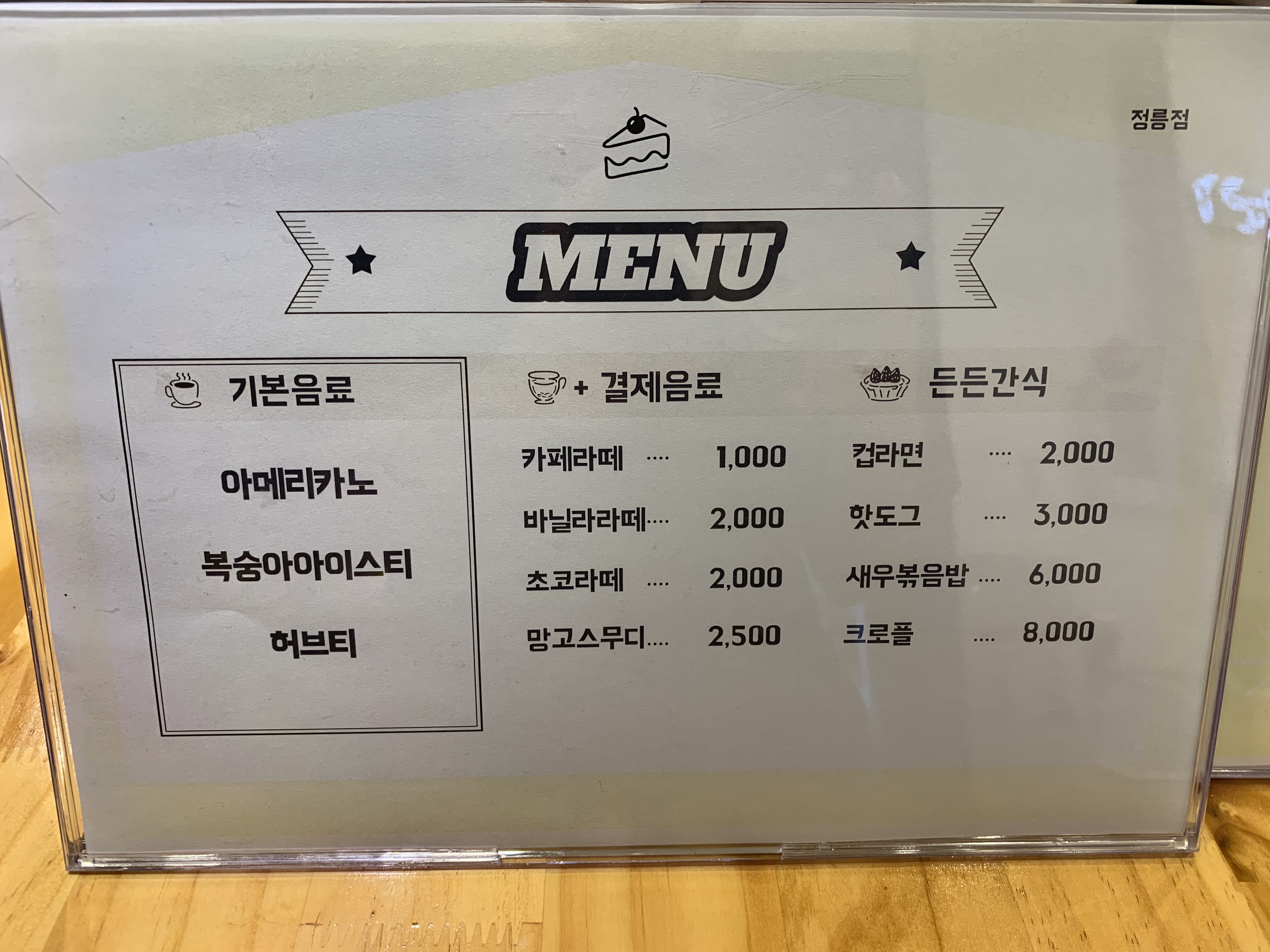 메뉴는 아메리카노, 아이스티와 카페라테, 바닐라라테, 초코라테 등이 있고 기본료 2,000원에 기본 아메리카노 또는 아이스티가 포함이다. 나머지 음료는 1,000원~2,500원 추가요금을 내고 마실 수 있는데 괜찮은 가격이다. 커피맛은 쏘쏘인 것 같고 개인적으로 달달한 걸 좋아해서 바닐라라테를 먹어봤는데 카페 느낌은 확실히 났다.