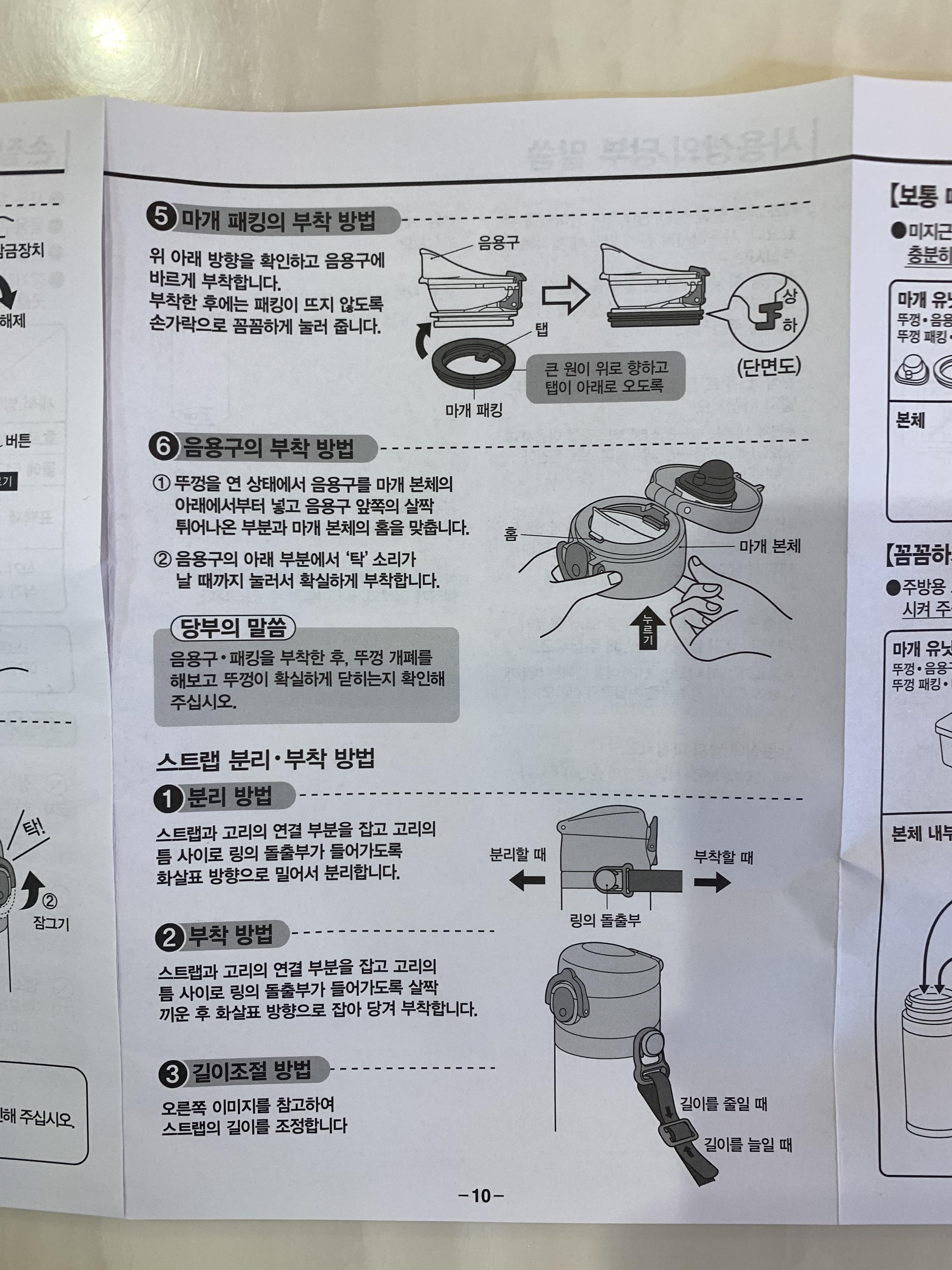 두 번째는 식기세척기와 식기건조기는 사용하지 말라고 합니다. 패킹은 사용이 가능한테 본체는 식기세척기의 열 때문에 부품이 변형되고, 음료가 새어 나와 화상을 입거나 주변을 더럽히는 원인이 된다고 합니다. 식세기에 넣었다는 건 뚜껑을 열고 음료는 버렸다는 뜻이니 주변을 더럽히는 건 드물 것 같습니다만 열 때문에 모양에 변형이 온다고 하니 식세기는 사용하지 말아야 할 것입니다.