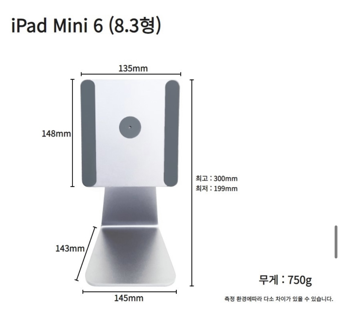 저는 아이패드 프로 12.9형 모델을 가지고 있어서 아래 사진의 가운데 12.9형 모델을 구매했습니다. 제품에 맞게 크기를 조절해서 선택의 폭을 넓게 가져갔네요. 아이 패드 프로 12.9 거치대를 기준으로 부착하는 철판의 사이즈가 가로는 265mm, 세로는 145mm입니다. 바닥에 거치했을 때 높이는 최대 290mm, 최저 190mm이며, 바닥에 닿는 면적은 가로 145mm, 세로 143mm로 뒤쪽으로 갈수록 좁아지는 사다리꼴의 형태를 띠고 있습니다. 무게는 1kg이 약간 넘는 1050g입니다.