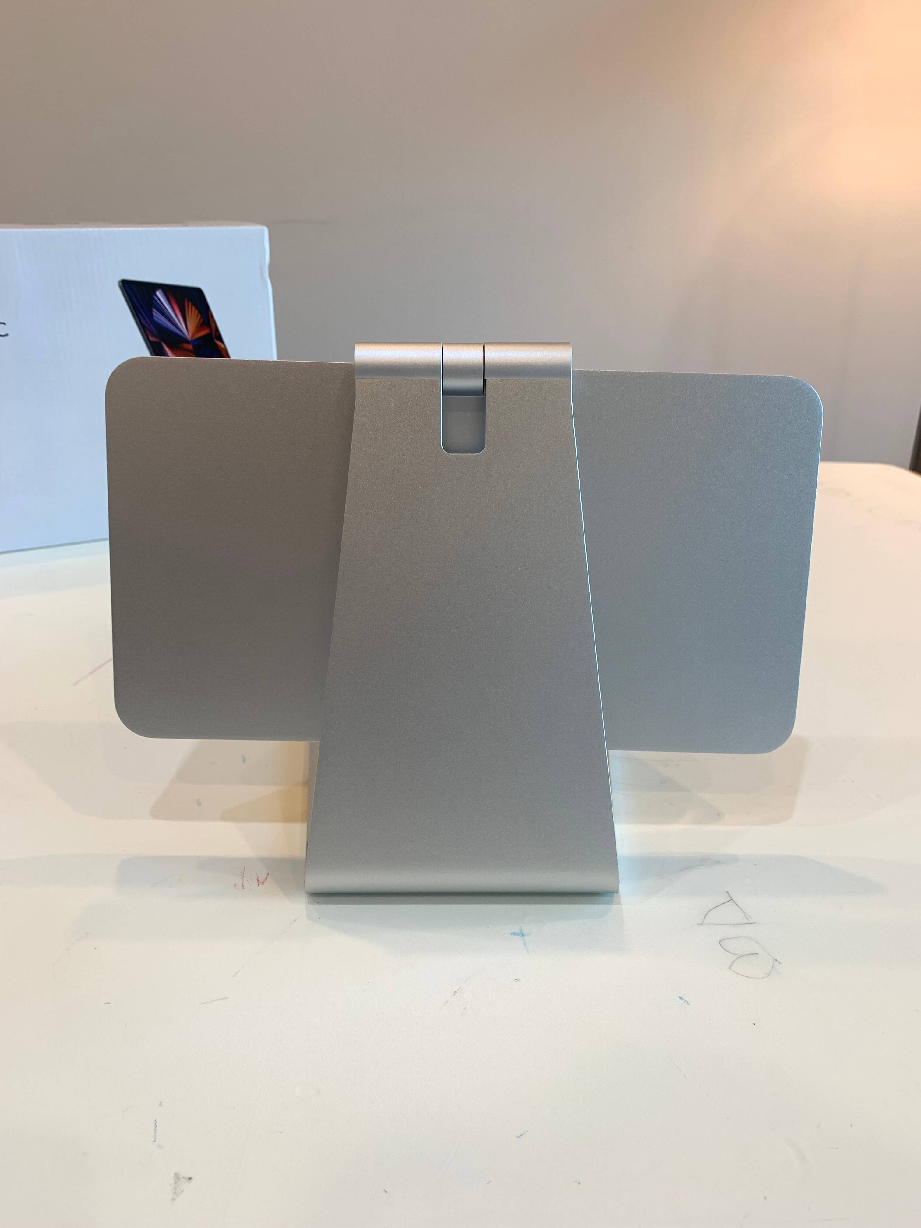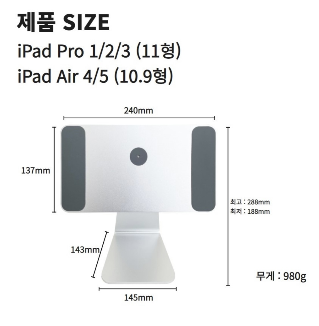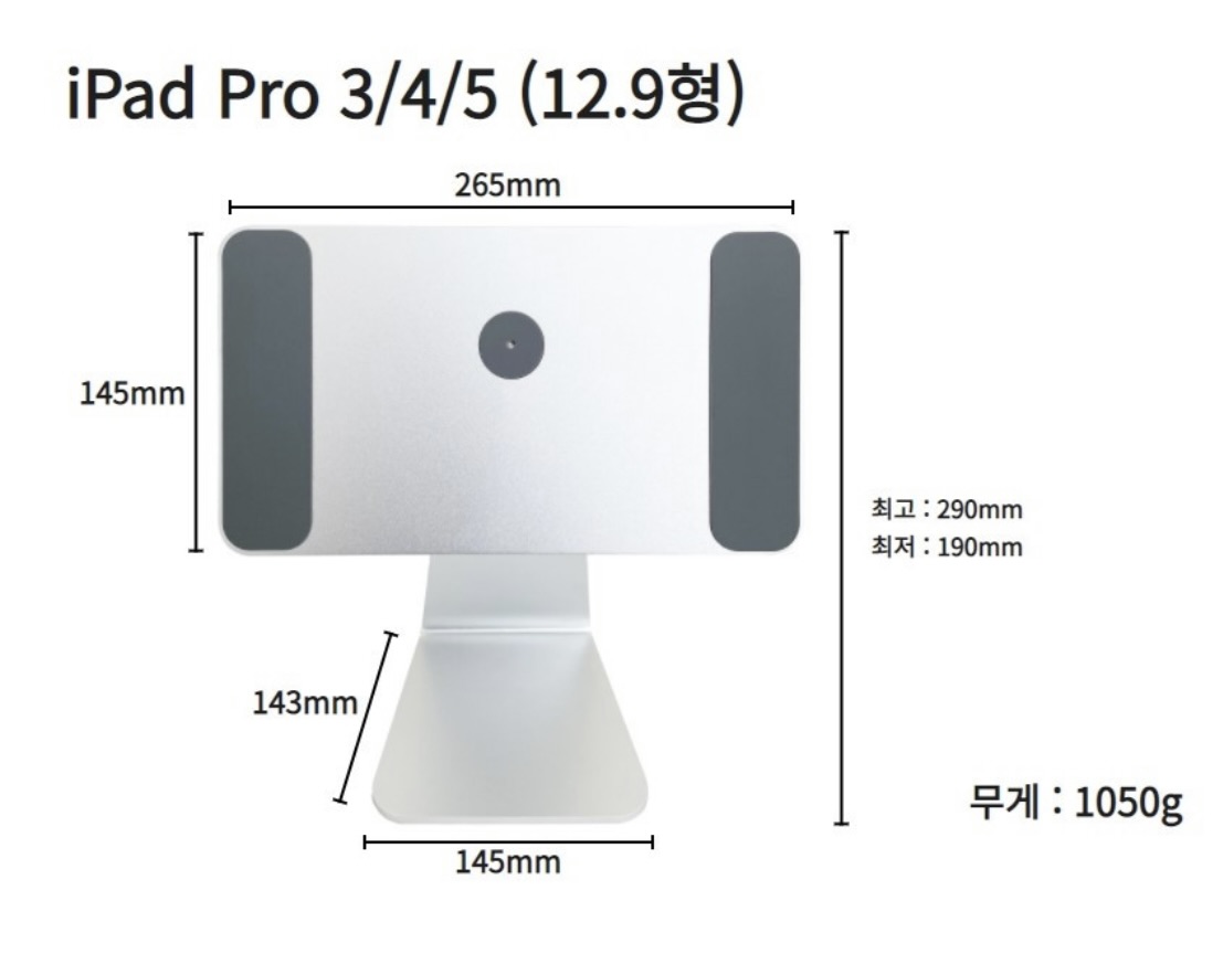 저는 아이패드 프로 12.9형 모델을 가지고 있어서 아래 사진의 가운데 12.9형 모델을 구매했습니다. 제품에 맞게 크기를 조절해서 선택의 폭을 넓게 가져갔네요. 아이 패드 프로 12.9 거치대를 기준으로 부착하는 철판의 사이즈가 가로는 265mm, 세로는 145mm입니다. 바닥에 거치했을 때 높이는 최대 290mm, 최저 190mm이며, 바닥에 닿는 면적은 가로 145mm, 세로 143mm로 뒤쪽으로 갈수록 좁아지는 사다리꼴의 형태를 띠고 있습니다. 무게는 1kg이 약간 넘는 1050g입니다.