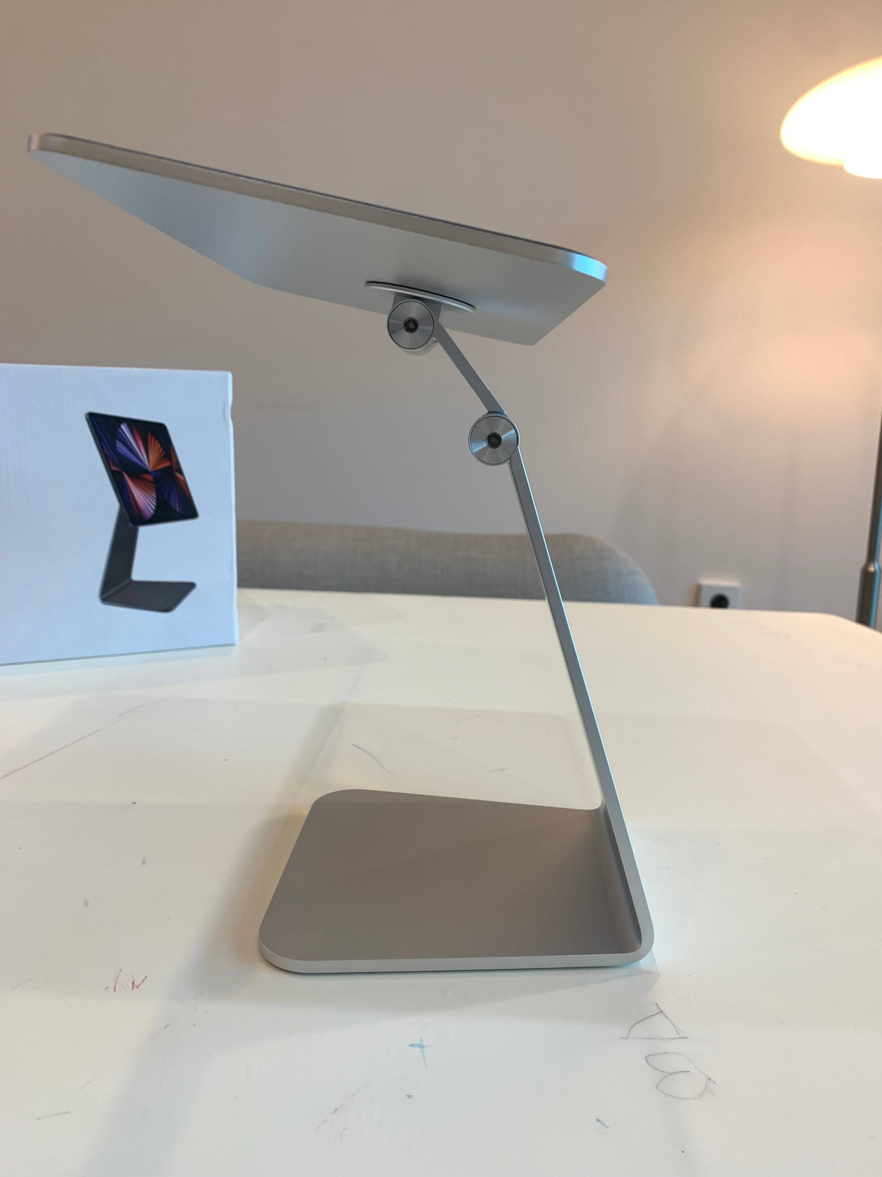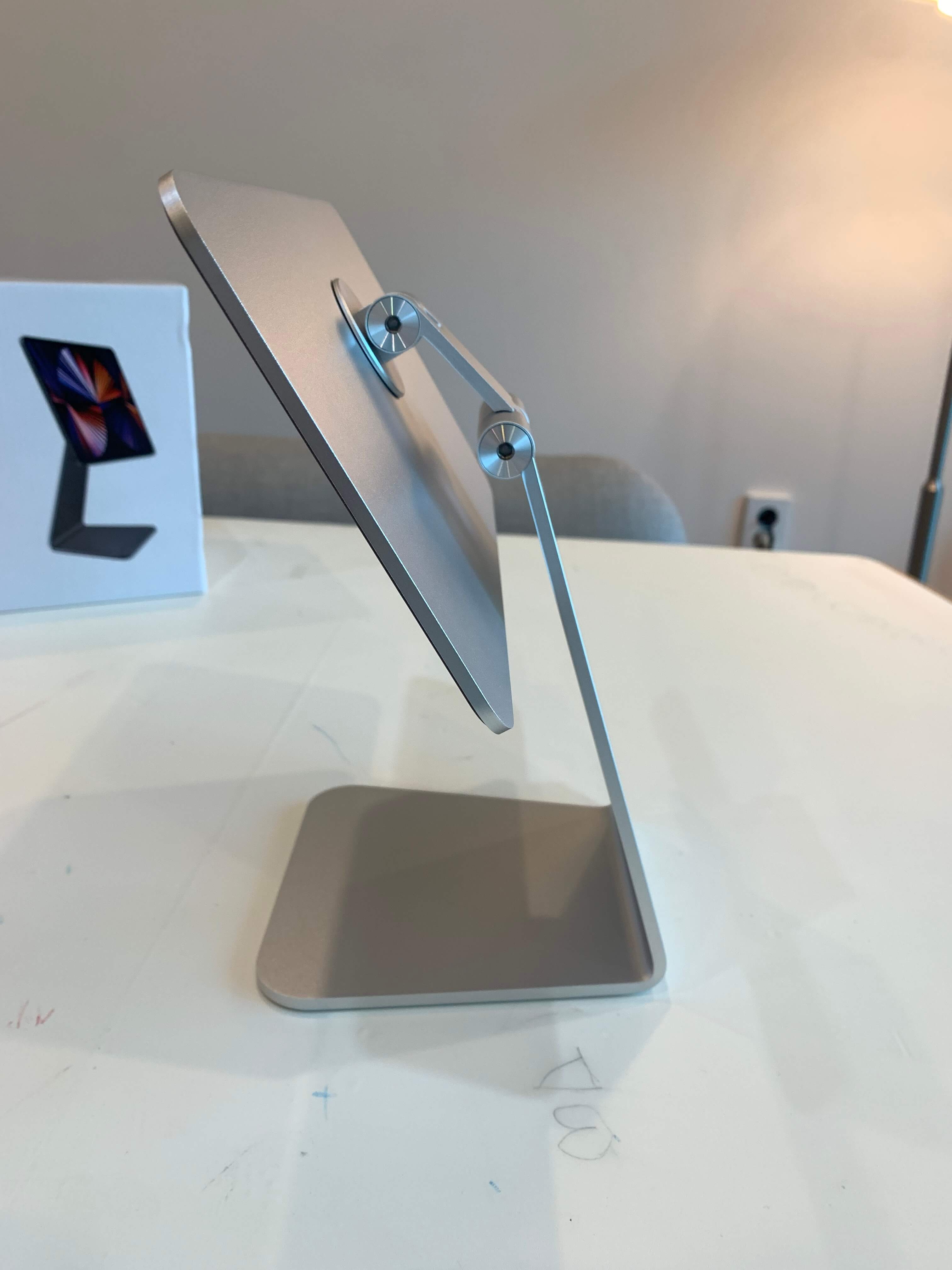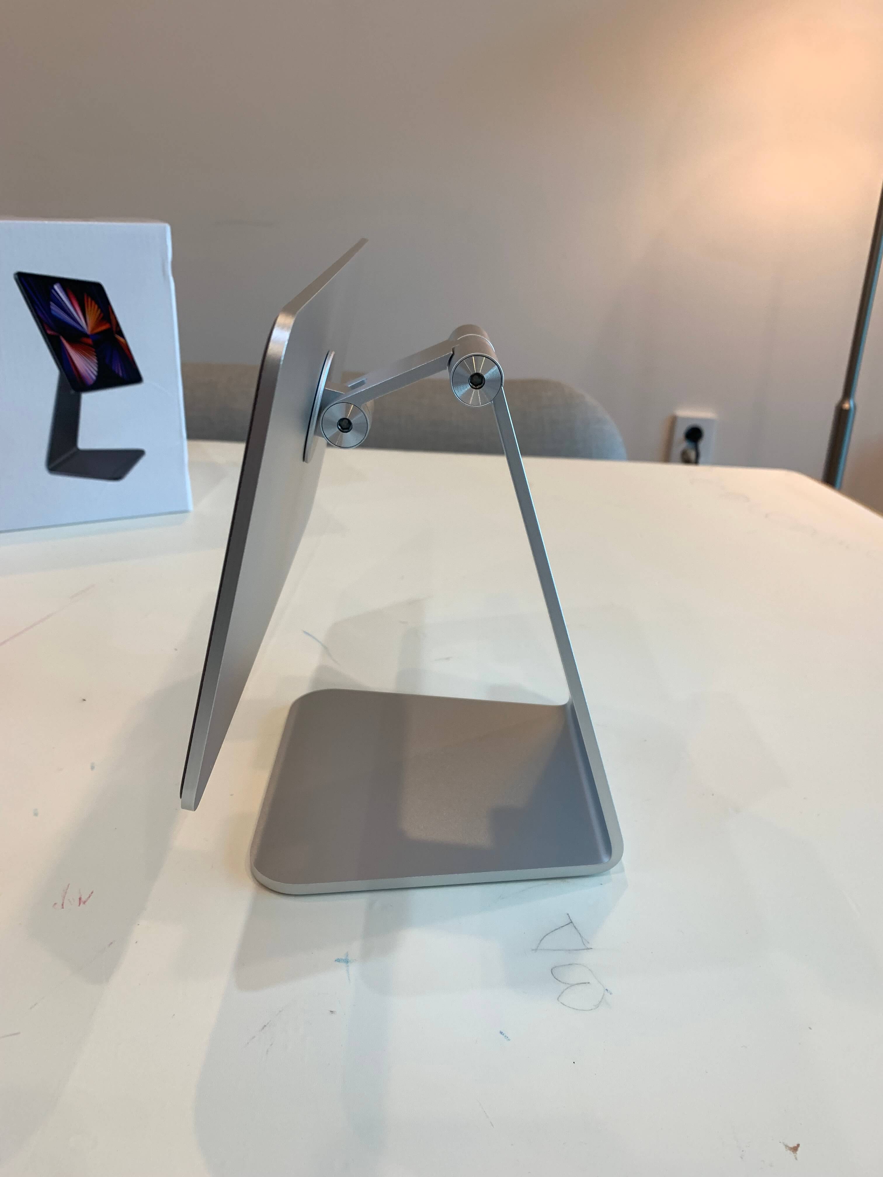 저는 아이패드 프로 12.9형 모델을 가지고 있어서 아래 사진의 가운데 12.9형 모델을 구매했습니다. 제품에 맞게 크기를 조절해서 선택의 폭을 넓게 가져갔네요. 아이 패드 프로 12.9 거치대를 기준으로 부착하는 철판의 사이즈가 가로는 265mm, 세로는 145mm입니다. 바닥에 거치했을 때 높이는 최대 290mm, 최저 190mm이며, 바닥에 닿는 면적은 가로 145mm, 세로 143mm로 뒤쪽으로 갈수록 좁아지는 사다리꼴의 형태를 띠고 있습니다. 무게는 1kg이 약간 넘는 1050g입니다.