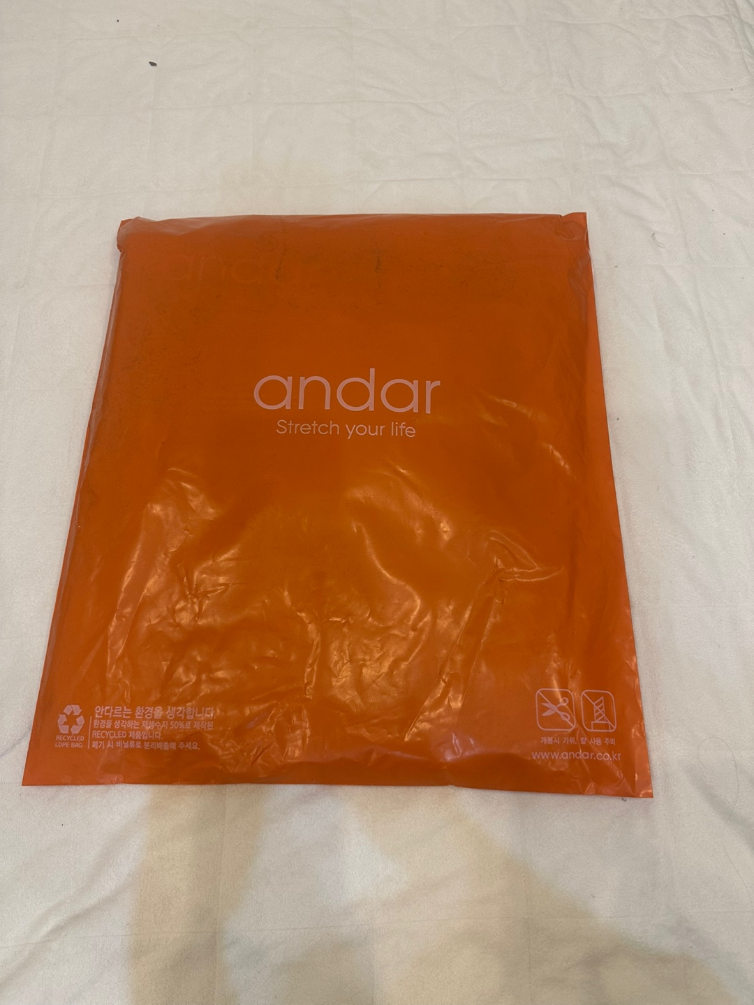 주황색의 안다르 택배가 왔다. 안다르는 전용 봉투에 넣어주기 때문에 택배가 오면 딱 알 수가 있다. 나름 봉투가지 신경쓴 모습이다. 물론 봉투는 바닥에서 굴렀을거라 먼지가 많이 붙어있지만 택배가 원래 그렇다.