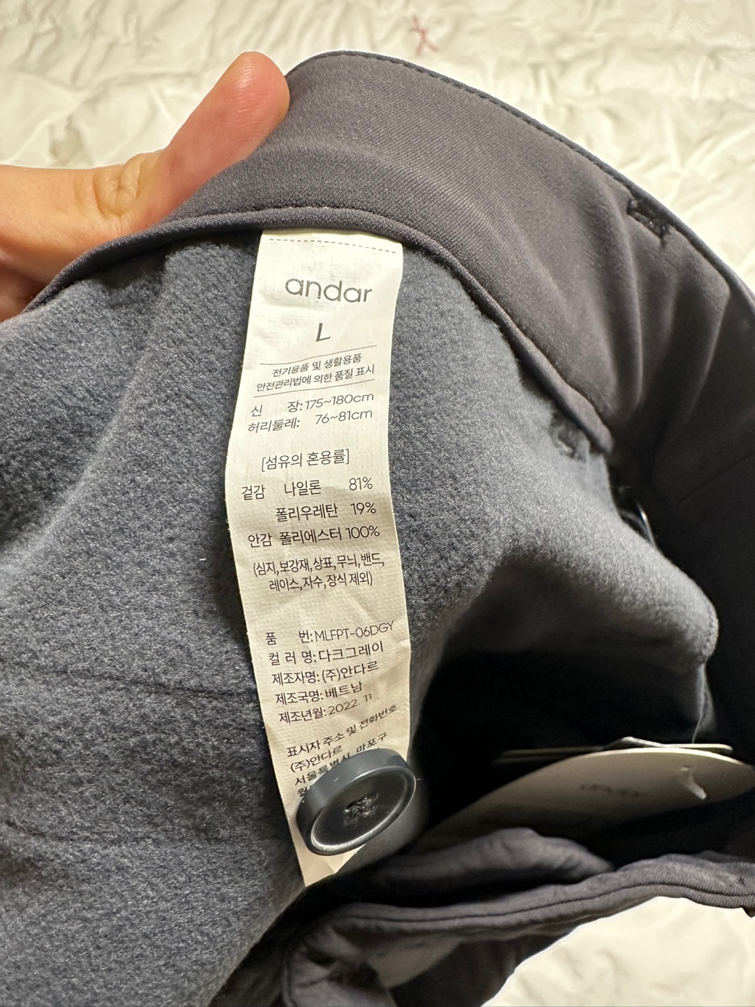 먼저 택을 확인해본다. '음 L로 맞게 왔군' 택을 확인하는데 안감으로 기모가 보인다. 만저보니 부들부들한게 마음에 든다. 지금이 24년 12월인데 제조년월은 22년 11월이다. 만든지 2년 정도야. 누가 사용한것만 아니면 괜찮다.