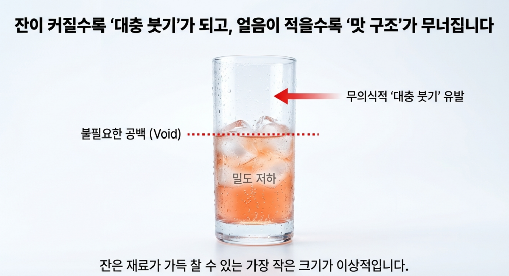 - 잔이 크면 → “대충 붓기”가 되기 쉬워서 → 술/탄산/얼음 밸런스가 흔들림