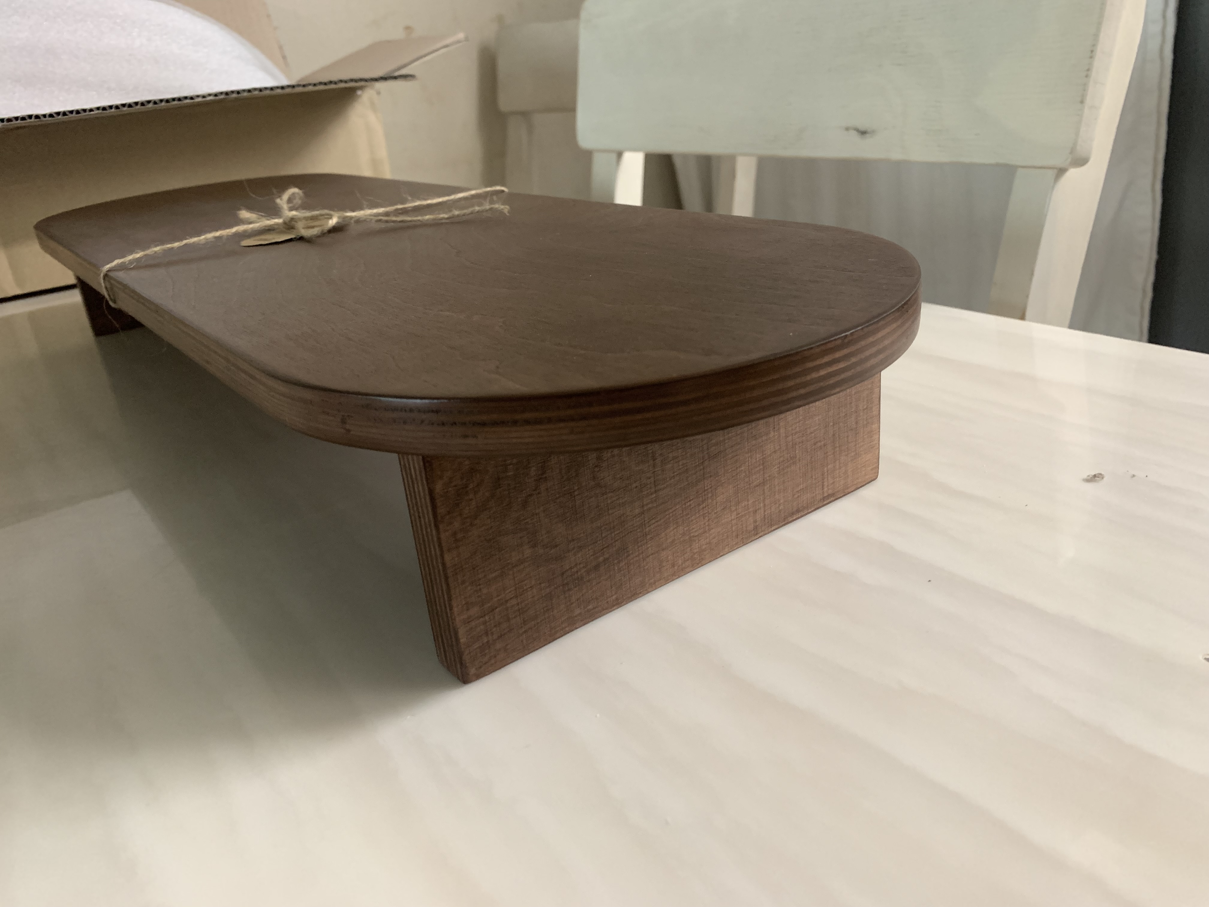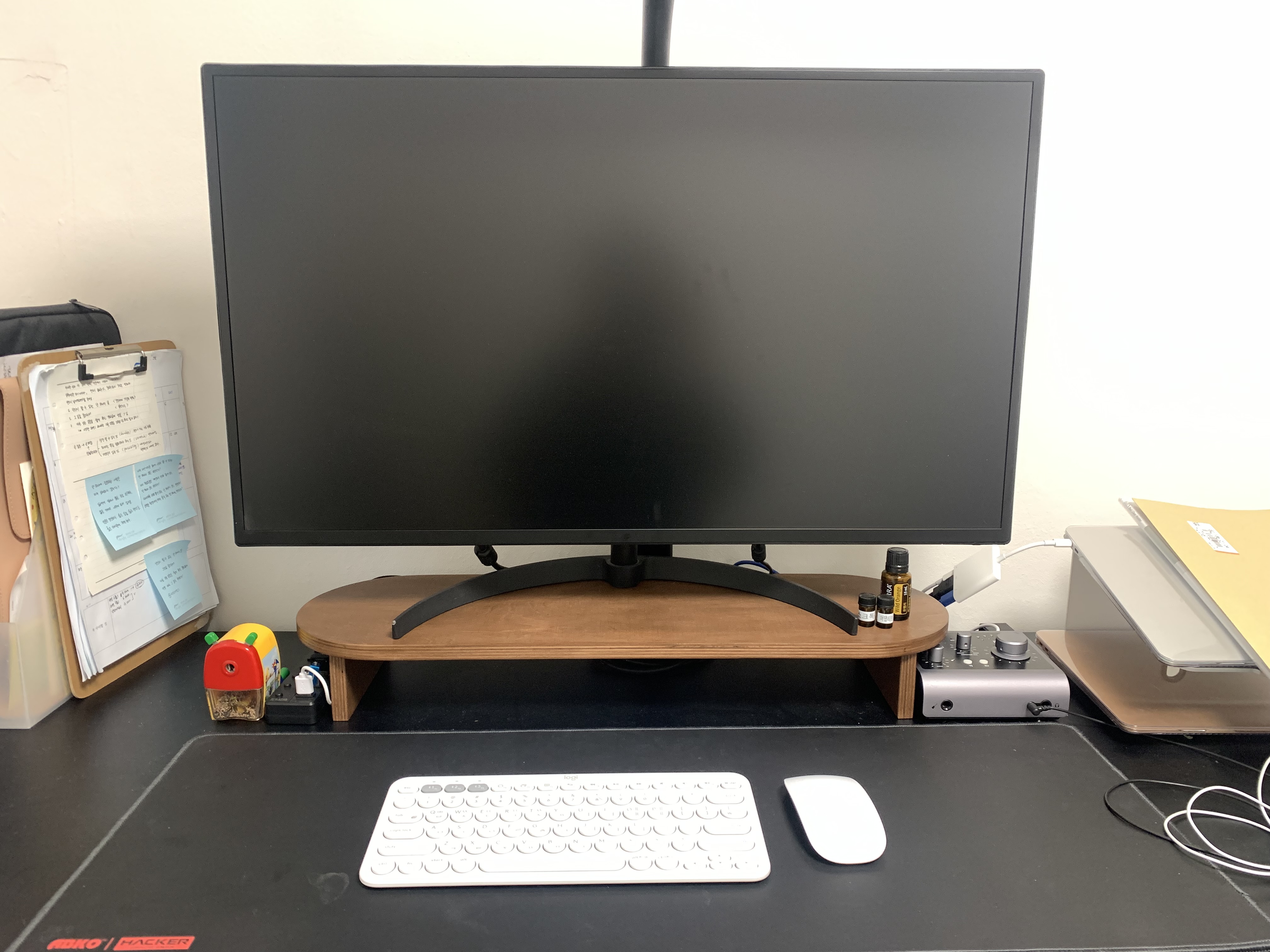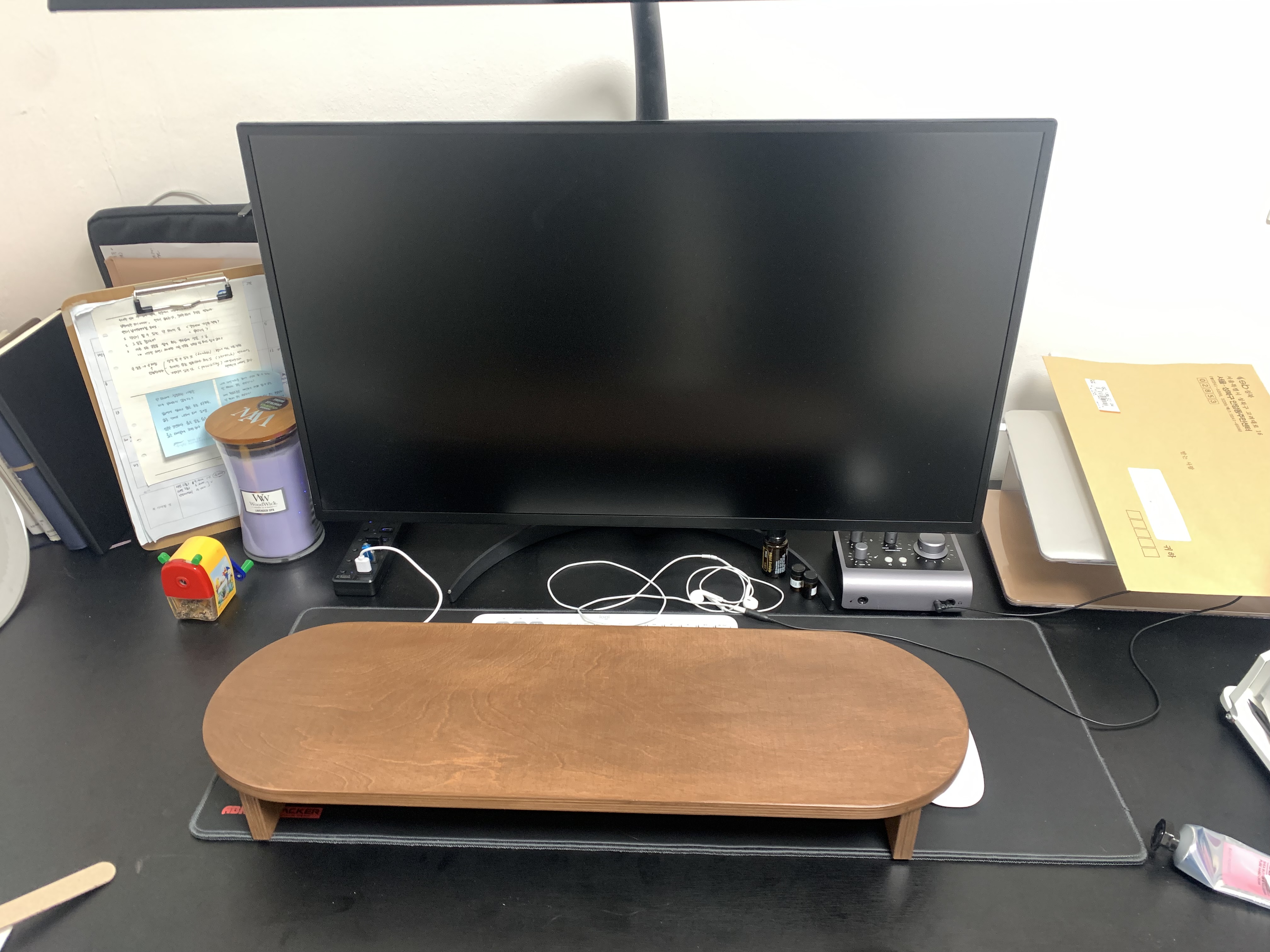 바로 책상에 가져가서 설치했습니다. 제 책상은 검은색이라 어떨지 궁금했는데요. 생각보다 정말 잘 어울리는 것 같습니다. 받침대가 기대만큼이나 품질이 좋고 고급스러워 정말 만족합니다. 나무 표면이 부들거리고 모서리 부분이 전부 다듬어져 있어서 까끌거린다거나 손에 걸리는 부분없이 매끄럽습니다. 실제 색상은 모니터에 따라 사진에 따라 다르긴 하지만 책상에 설치한 사진보단 위 식탁에서 찍은 사진과 비슷한것 같습니다.