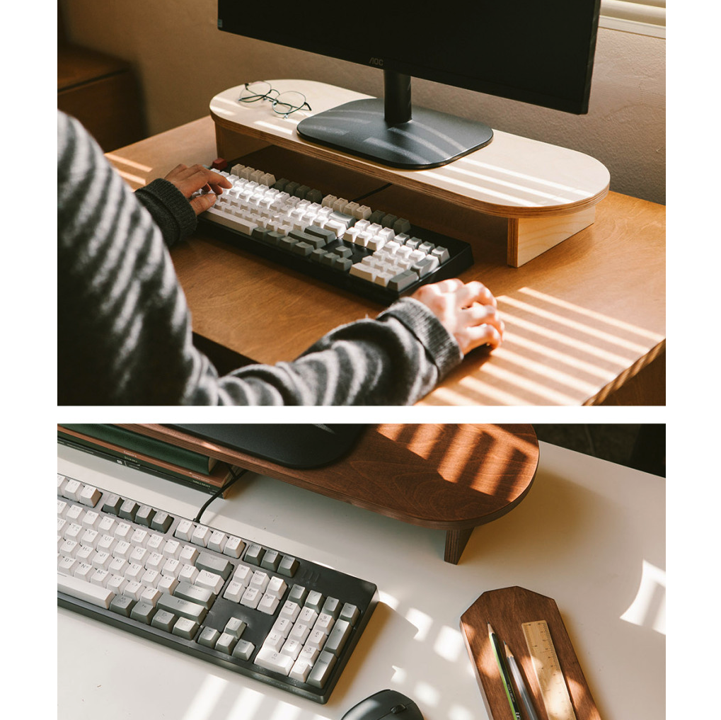 그러던 찰라 우연히 타 블로그를 통해 오니프 모니터 받침대를 보고 깜짝 놀랐습니다. 첫째는 디자인, 둘째는 색상, 셋째는 가격 때문이었습니다. 미니멀하면서도 공방에서 정성스럽게 만든듯한 디자인은 빈티지하면서도 오랫동안 사용한 원목가구의 느낌이었습니다. 색상은 월넛과 자작 두 가지가 있었고 가장 놀랐던 건 3만 원대의 가격이었습니다. 인스타 데스크 셋업에 나오는 많은 우드 브랜드들의 가격을 보면 모니터 받침대 하나에 20만 원대를 넘기고 조금 싸다고 하더라도 중국 제품은 당기지 않았었는데 3만 원대의 가격으로 이런 품질과 디자인의 퀄리티라니! 바로 주문했습니다.