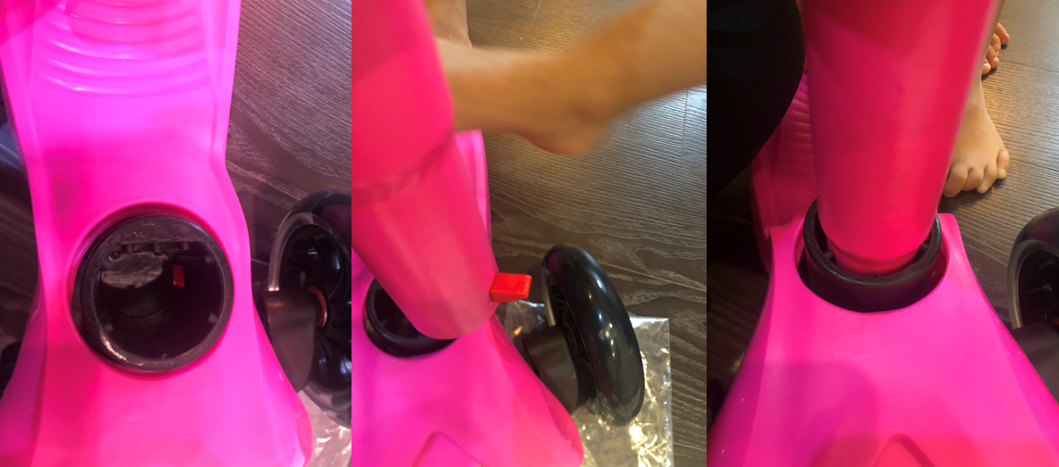 다음은 손잡이 스탠드를 발판에 결합시켜 주시면 됩니다. 좌측 사진 검은색 홈 안쪽에 네모난 홈이 보이시나요? 여기에 중간 사진 중간의 붉은색 돌기가 결합되면 딱하는 소리와 함께 걸리면서 결합됩니다.