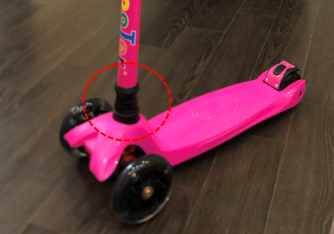 위 사진의 빨간색 동그라미 부분인데요. 저 검은색 부품을 발판 쪽 구멍 안쪽으로 힘으로 눌러 넣으면 구명에 꽉 조이면서 고정되는 방식으로 설계되어 있는데요. 문제는 저 부품이 킥보드를 타고 몇 시간이 지나면 위로 빠지면서 고정됐던것이 풀린다는 것입니다. 고정이 풀리면 그 유격으로 손잡이가 흔들리고요. 처음에는 잘 안 풀리지만 몇 개월 사용하다 보면 계속 다시 끼고 빠지고 가 반복되어 좀 불편한 사항이 발생하였습니다. 다른 문제가 생겼을 때 부품을 분해하기 위해서 저렇게 설계했을 수도 있지만 당장 빠른 속도로 킥보드를 타는 아이가 조금 위험할 수도 있다는 생각이 들었습니다.