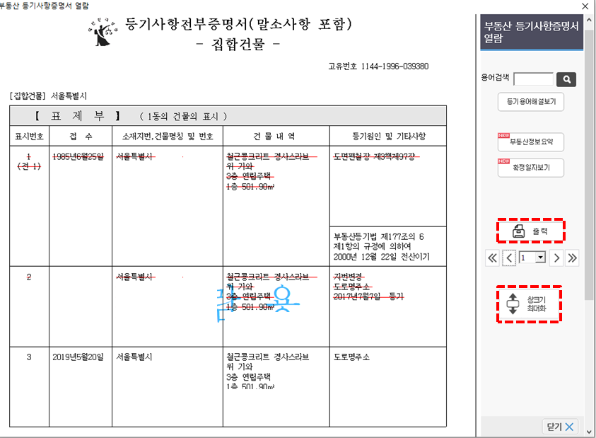 열람의 화면이 궁금하신 분들을 위해서 열람 또한 해보았습니다. 열람 신청을 완료하면 아래와 같은 화면이 나옵니다. 좌측에는 등기사항에 대한 정보가 표시되고 우측에 출력과 창크기, 페이지 조절 버튼이 있습니다.