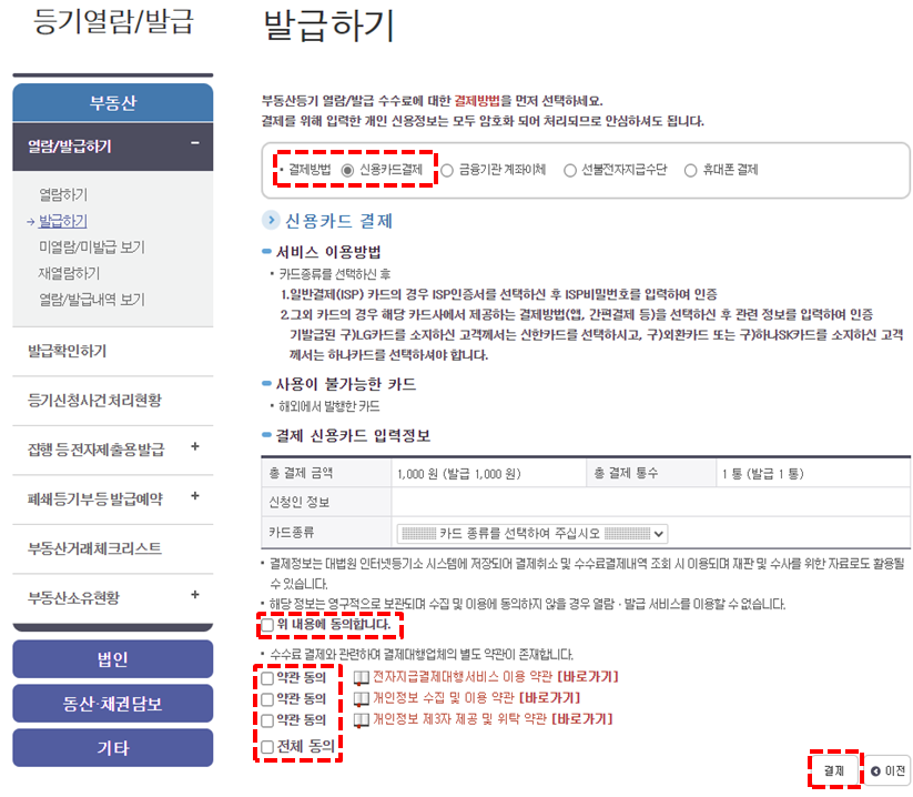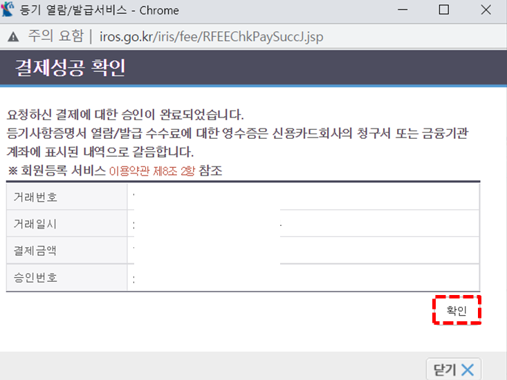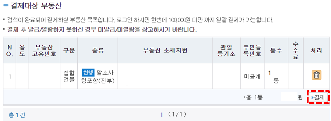 마지막으로 부동산 소재 지번 등 신청한 정보가 맞는지 확인한 후 결제 버튼을 클릭합니다.