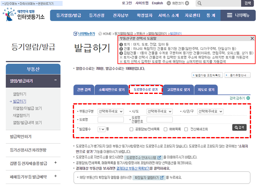 그럼 본인이 편한 찾기 옵션으로 들어가서 검색해주시면 됩니다. 저는 도로명이 편해서 도로명으로 검색하였습니다. 주의사항은 좌측 상단에 있는 부동산 구분을 검색할 시 아래 빨간 실선으로 표시된 도움말을 꼭 읽어보셔야 합니다. 보통 아파트와 다세대 빌라를 건물로 선택하는 경우가 많은데요. 아파트와 빌라는 집합건물로, 일반주택 및 다가구 주택은 건물로 선택해야 합니다.