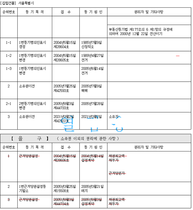 세번재와 네번째 페이지에는 소유권과 소유권 이외의 권리에 관한 사항인 갑구와 을구가 표시됩니다. 쉽게 말해 건물의 주인이 바뀐 내역과, 건물에 대한 대출이 있는지 여부가 나타납니다.