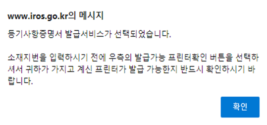 발급하기를 선택하면 출력을 한다는 의미이기 때문에 지번 입력 전 프린터 확인을 먼저 하라는 메시지가 표출됩니다. 프린터가 있어야 발급이 가능하오니 자택에 프린터가 없으신 분들께서는 열람하기를 하셔서 사진 찍기 등을 이용해 확인하시는 것도 방법일 것입니다.