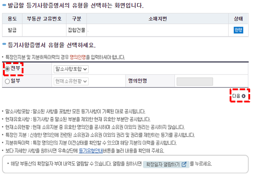 위 빨간색 네모 박스가 아래와 같이 변경됩니다. 부동산이 공동소유로 특정인의 지분을 확인하는 게 아니라면 전부를 선택하고 다음을 누릅니다.